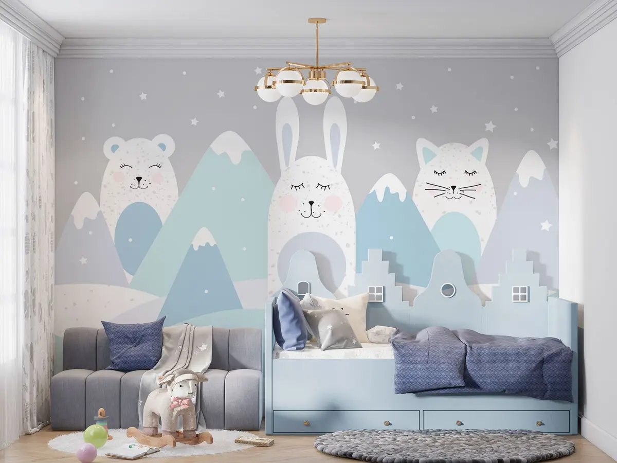 Fototapeten Hase, Bär, Fuchs auf dem Hintergrund der beige schneebedeckten Berge N° u98135v1