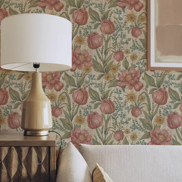 Tapete Vintage-Tulpen und Astern, strukturierter cremefarbener Hintergrund Nr. a00773