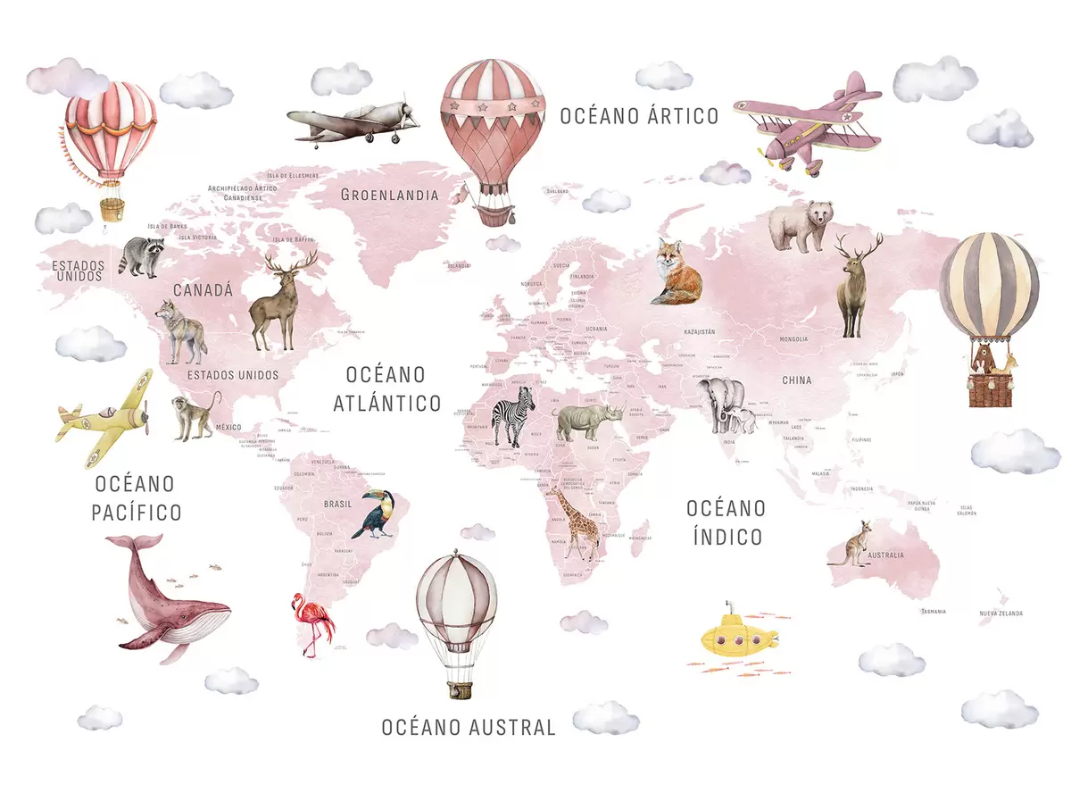 Fototapeten Kinderkarte im Aquarellstil mit Tieren und Heißluftballons. Spanische Sprache. Rosa Farbe. N° c00001esv3