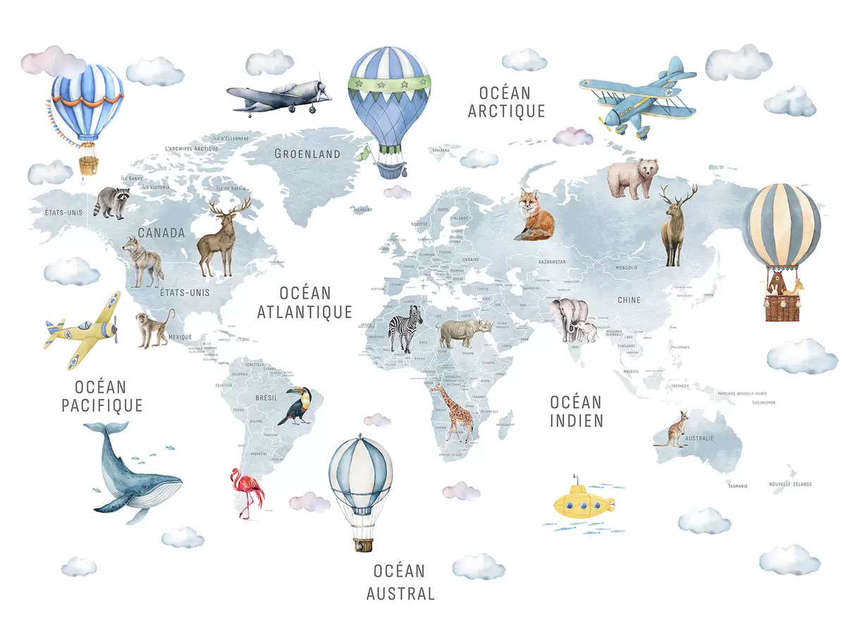 Fototapeten Kinderkarte im Aquarellstil mit Tieren und Heißluftballons. Französische Sprache. Blaue Farbe. N° c00001frv1