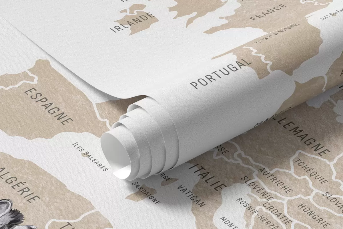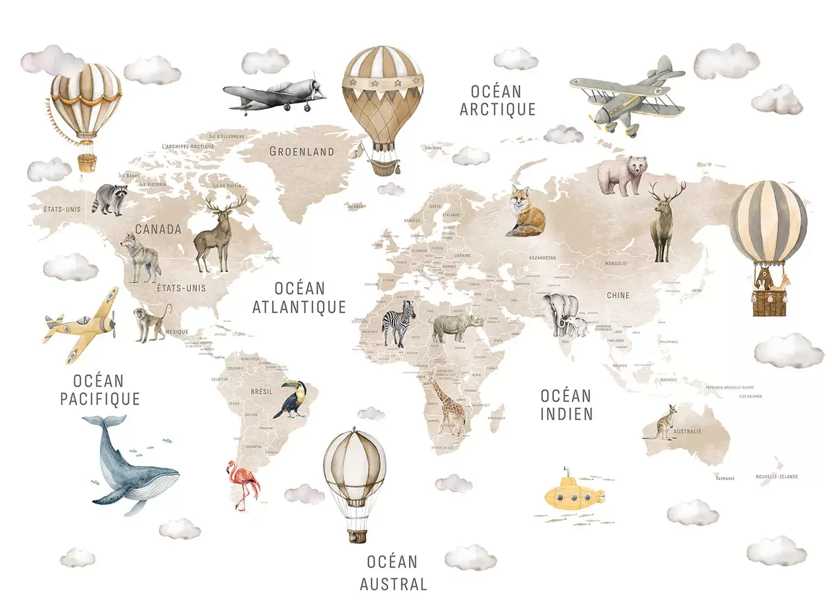 Fototapeten Kinderkarte im Aquarellstil mit Tieren und Heißluftballons. Französische Sprache. Beige Farbe N° c00001frv2