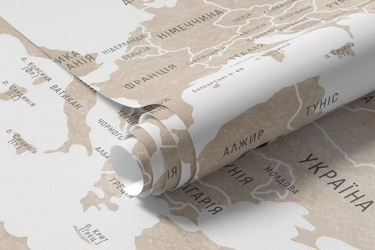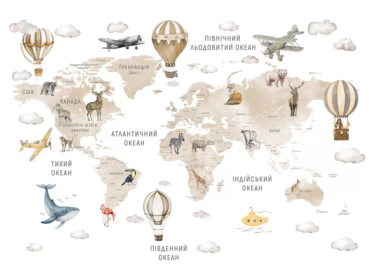 Fototapeten Kinderkarte im Aquarellstil mit Tieren und Heißluftballons. Ukrainische Sprache. Beige Farbe. N° c00001ukv2