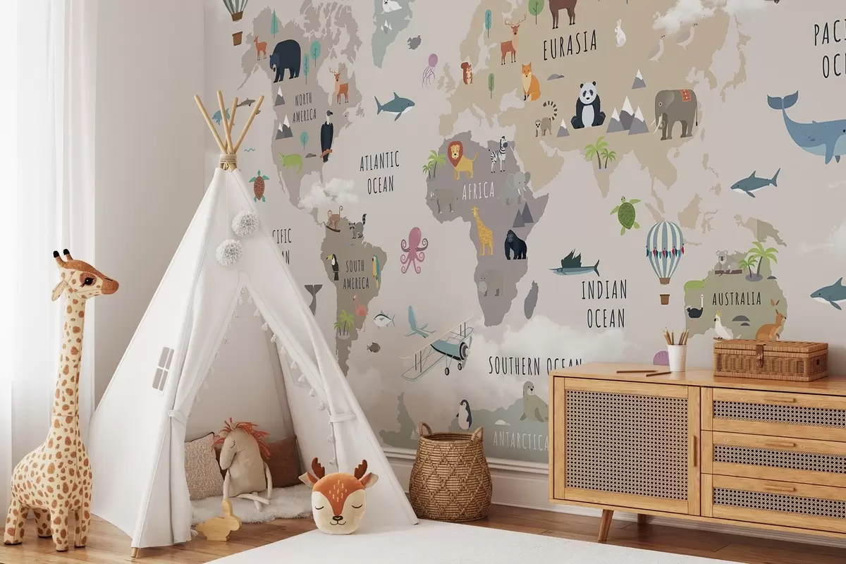 Fototapeten Kinderweltkarte mit Tieren und Heißluftballons. Englische Sprache N° c00002en