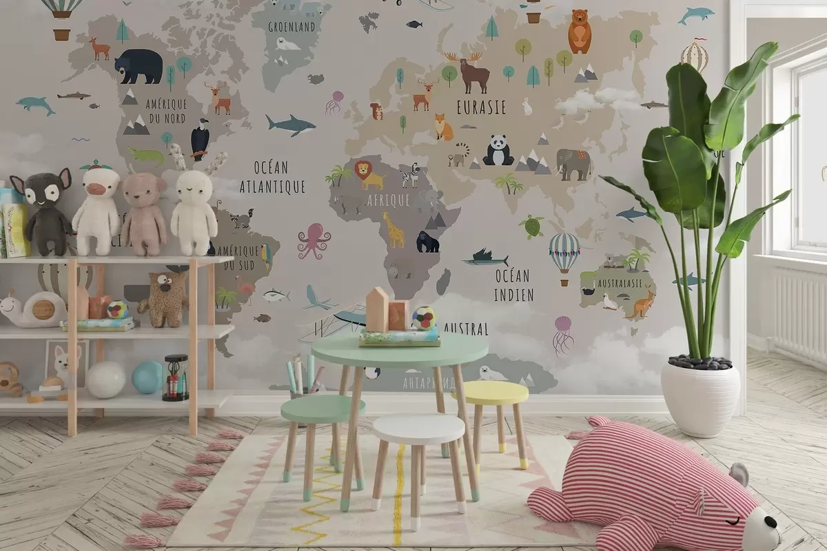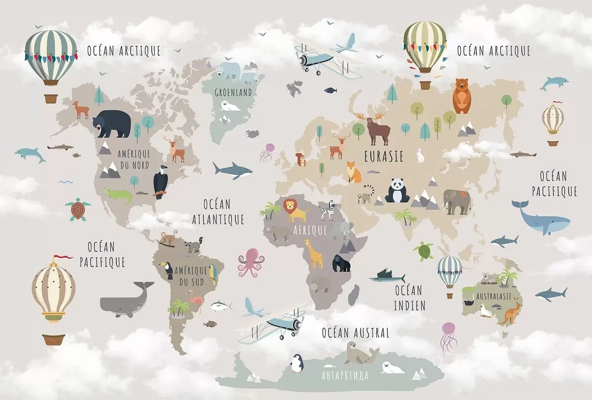 Fototapeten Kinderweltkarte mit Tieren und Heißluftballons. Französische Sprache N° c00002fr