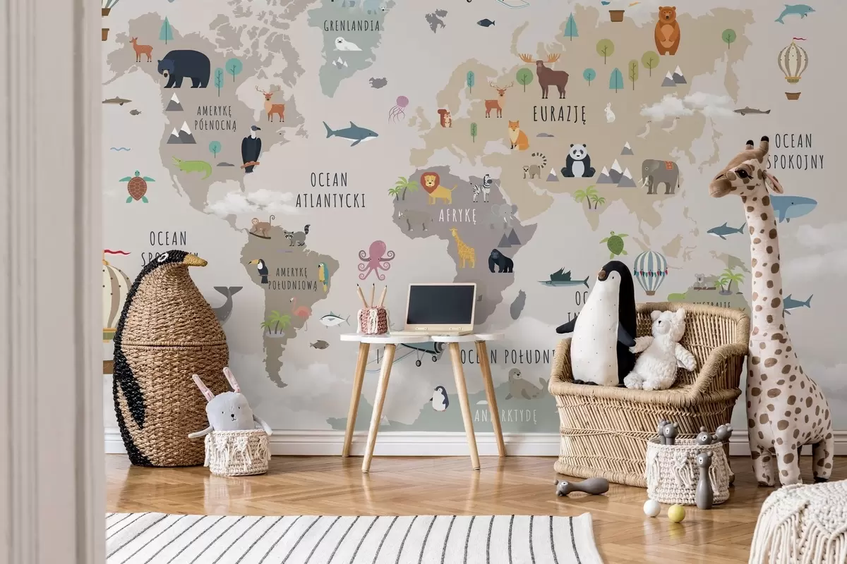 Fototapeten Kinderweltkarte mit Tieren und Heißluftballons. Polnische Sprache N° c00002pl
