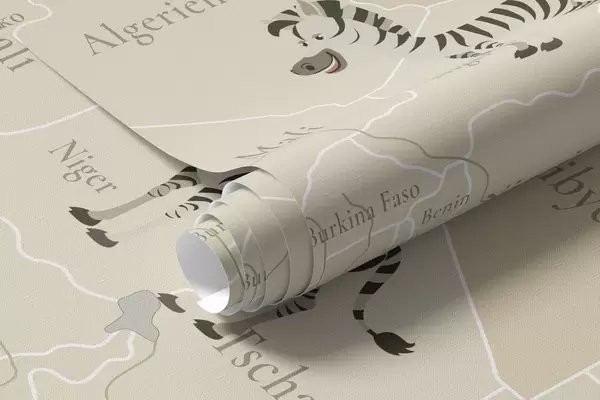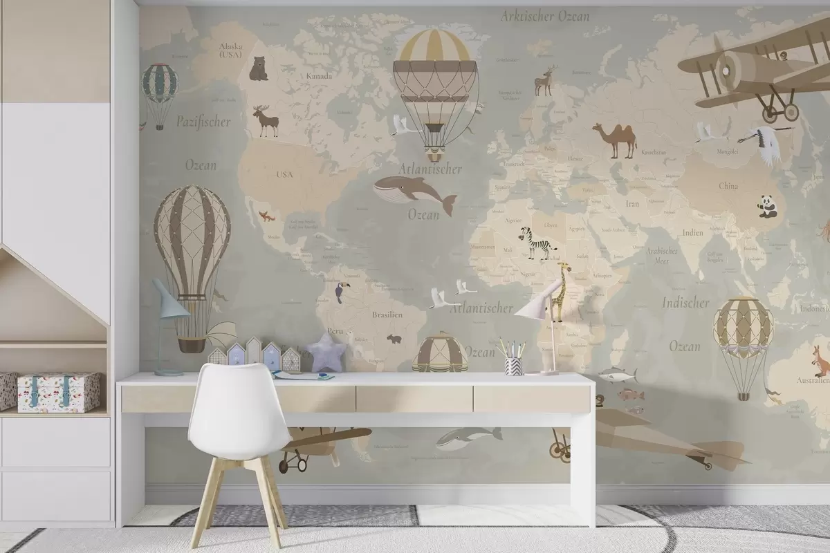Fototapeten Kinderweltkarte mit Tieren, Flugzeugen und Heißluftballons. Deutsche Sprache. Farbe: Beige N° c00003de