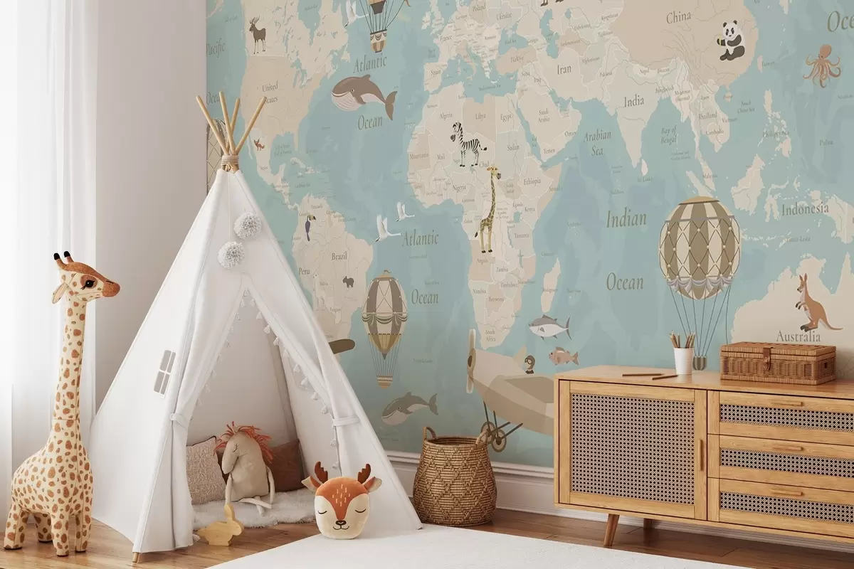 Fototapeten Kinderweltkarte mit Tieren, Flugzeugen und Heißluftballons. Englische Sprache. Blaue Farbe. N° c00003env1