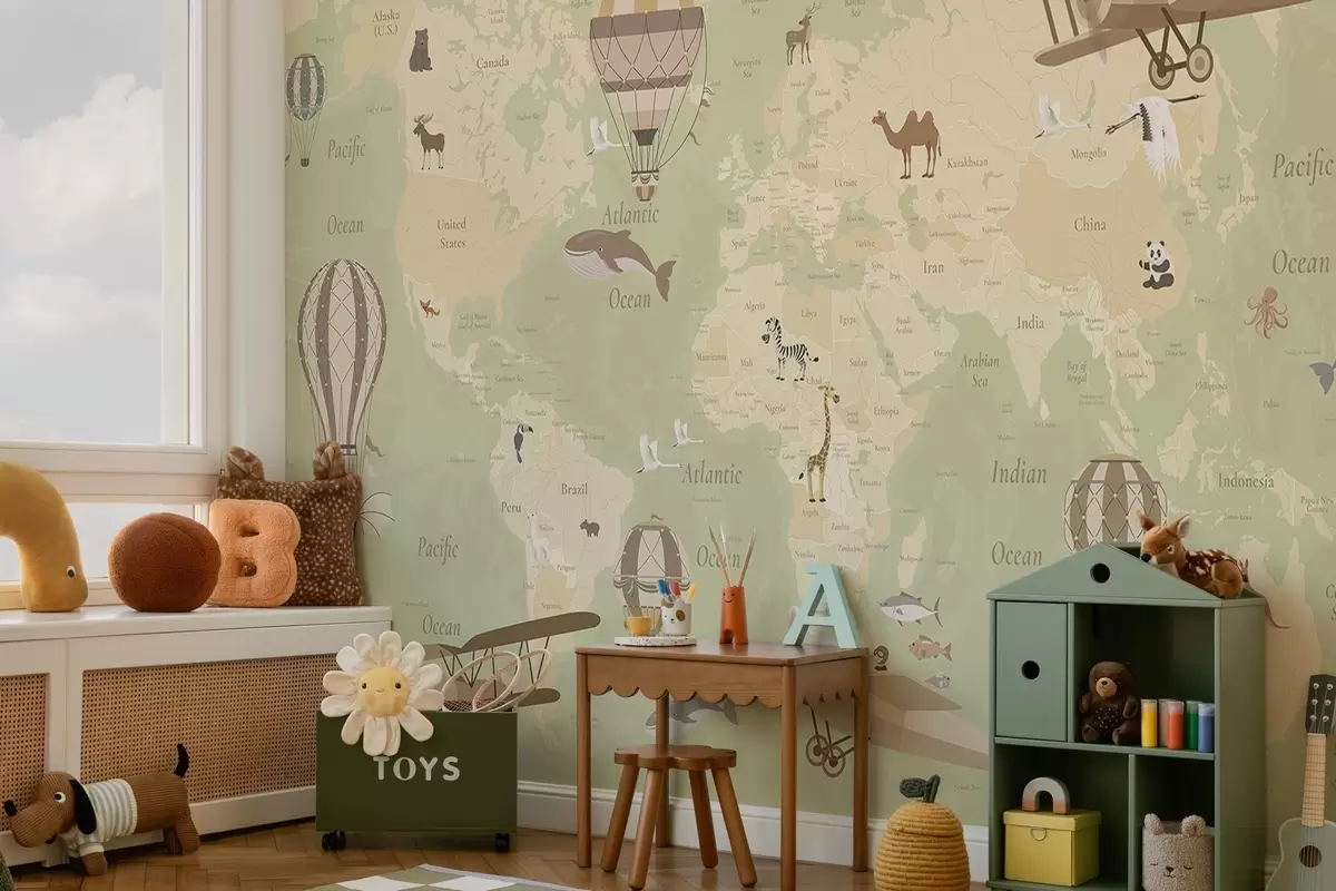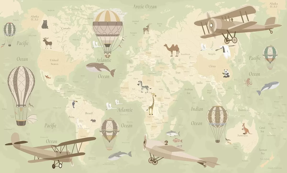Fototapeten Kinderweltkarte mit Tieren, Flugzeugen und Heißluftballons. Englische Sprache. Grüne Farbe. N° c00003env2