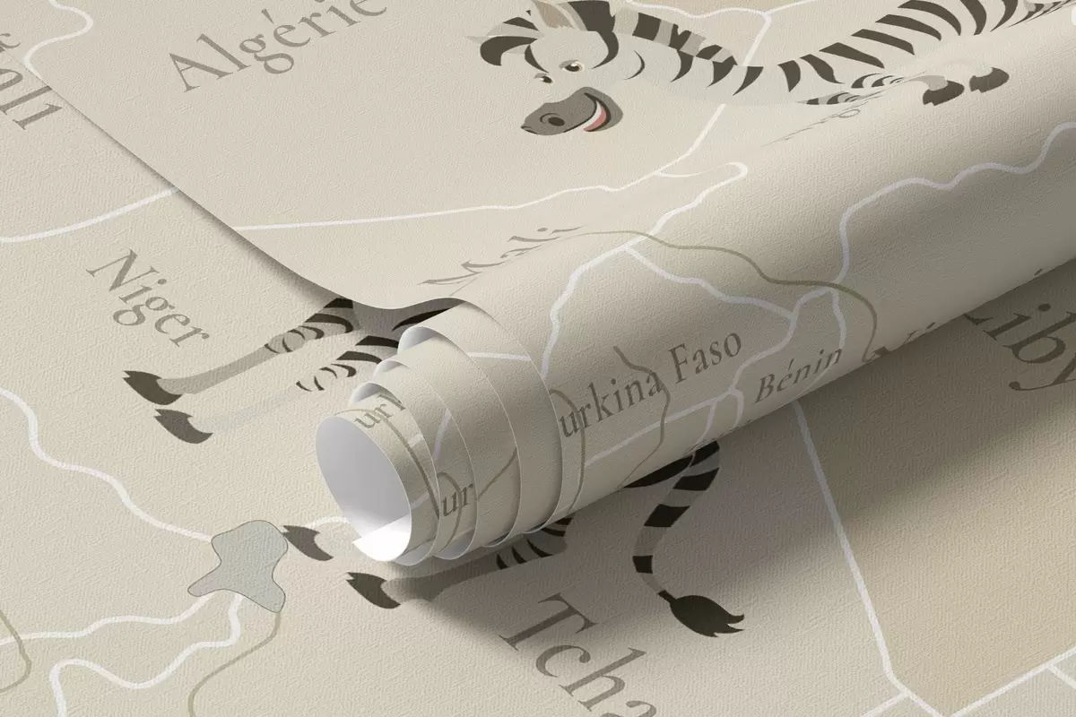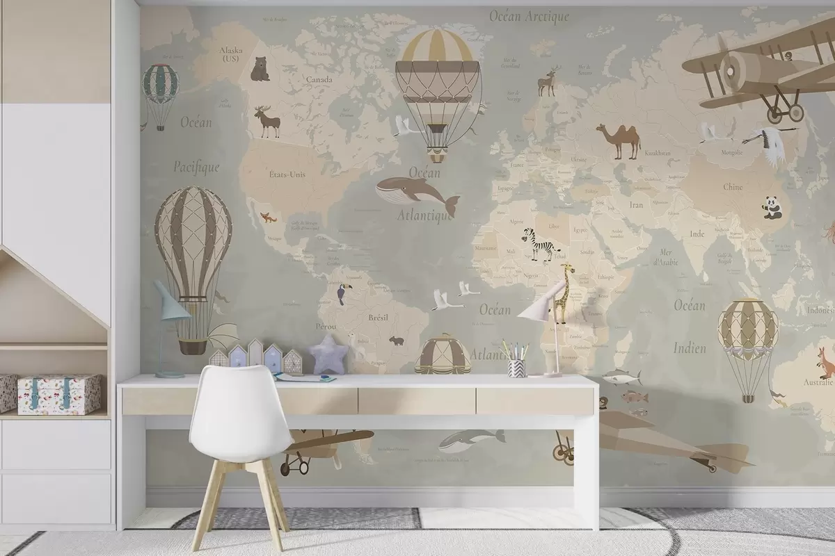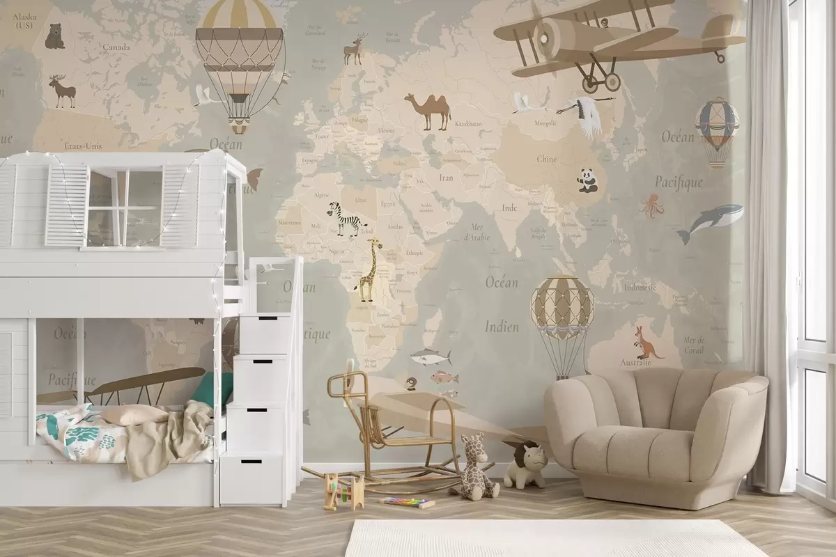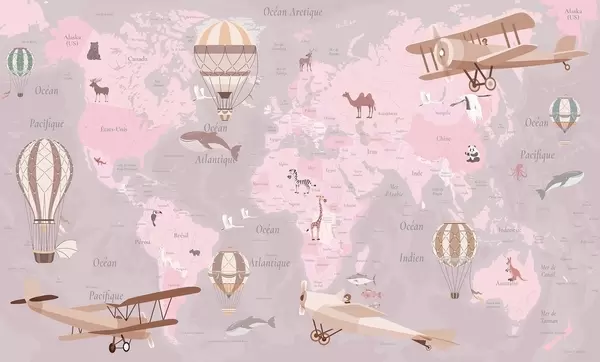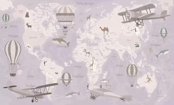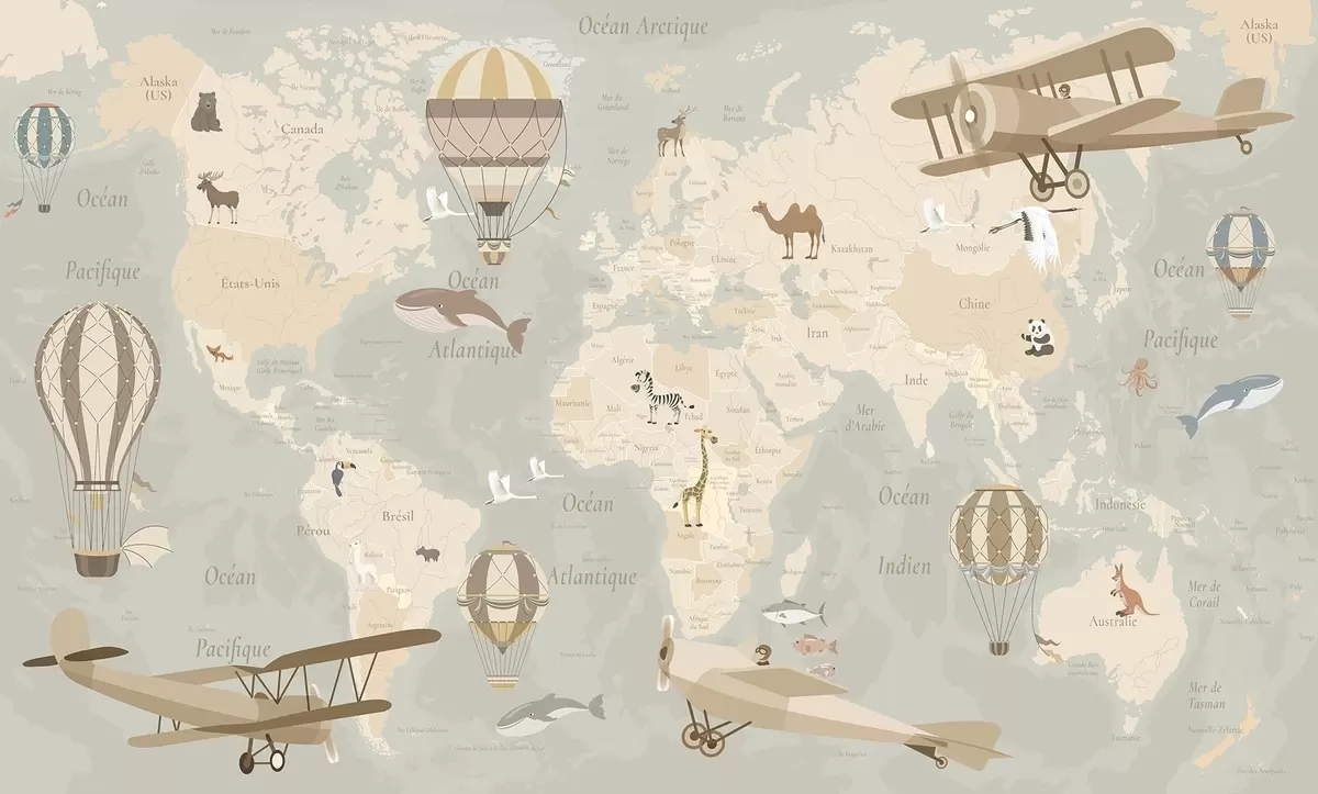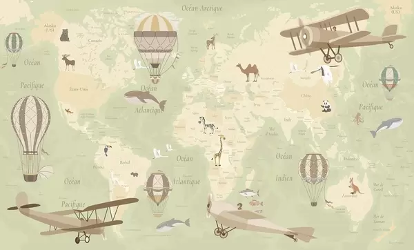 Fototapeten Kinderweltkarte mit Tieren, Flugzeugen und Heißluftballons. Französische Sprache. Beige Farbe N° c00003fr