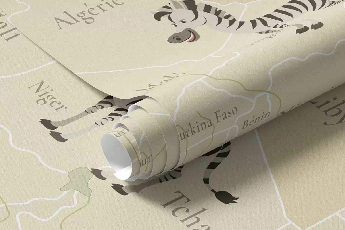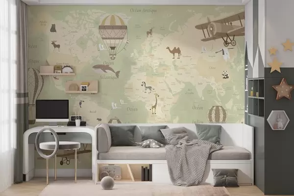 Fototapeten Kinderweltkarte mit Tieren, Flugzeugen und Heißluftballons. Französische Sprache. Grüne Farbe. N° c00003frv2