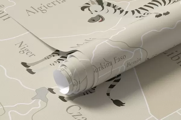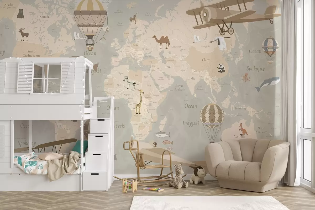 Fototapeten Kinderweltkarte mit Tieren, Flugzeugen und Heißluftballons. Polnische Sprache. Beige Farbe N° c00003pl