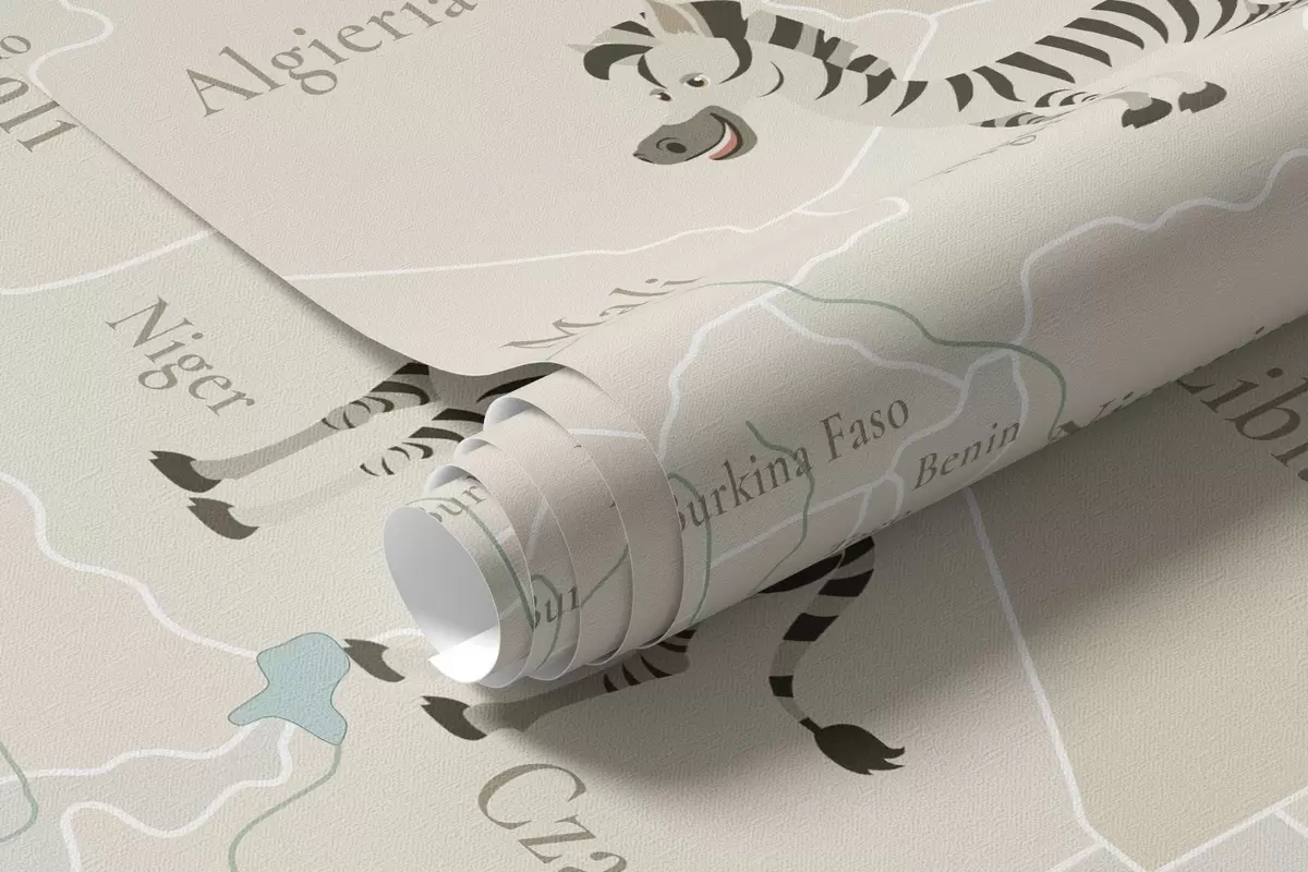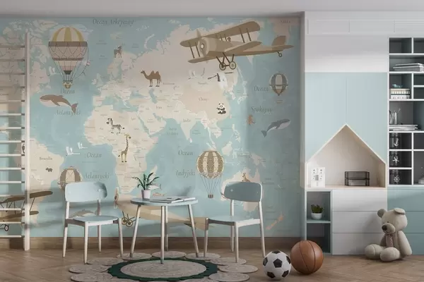 Fototapeten Kinderweltkarte mit Tieren, Flugzeugen und Heißluftballons. Polnische Sprache. Blaue Farbe. N° c00003plv1