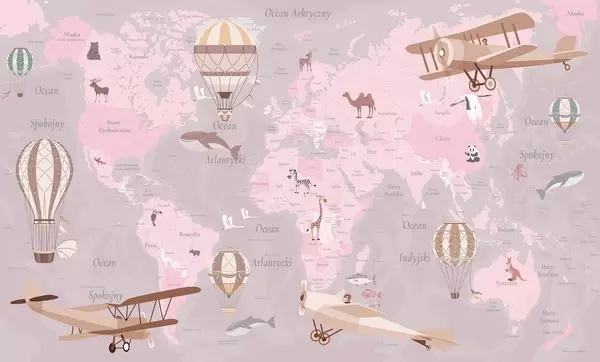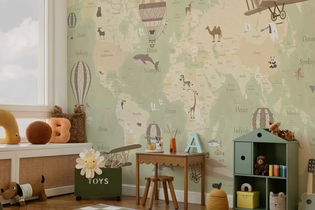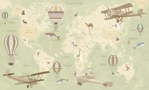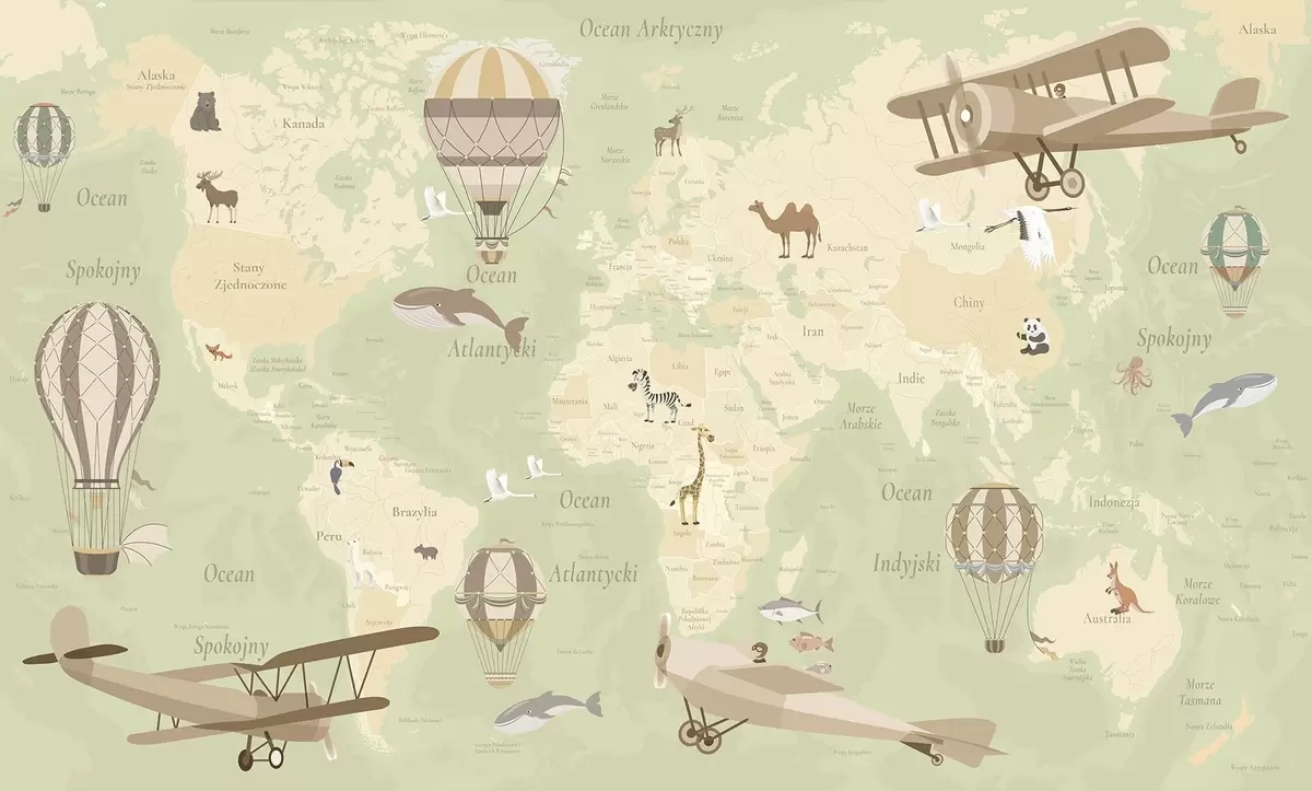 Fototapeten Kinderweltkarte mit Tieren, Flugzeugen und Heißluftballons. Polnische Sprache. Grüne Farbe N° c00003plv2
