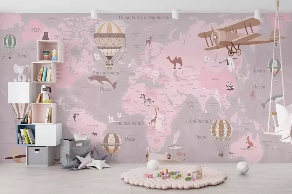 Fototapeten Kinderweltkarte mit Tieren, Flugzeugen und Heißluftballons. Ukrainische Sprache. Rosa Farbe N° c00003ukv3