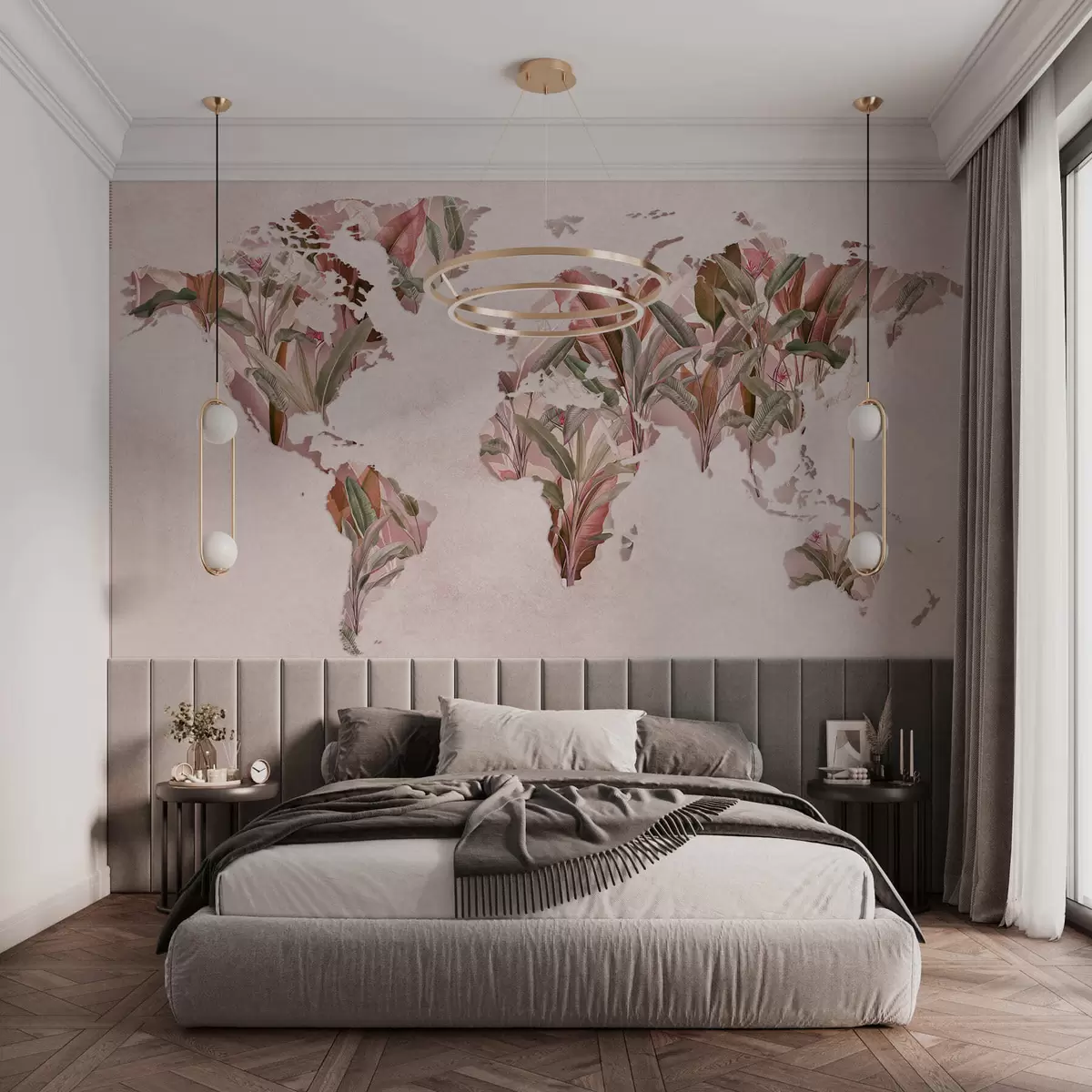 Fototapeten Eine rosa Weltkarte aus Bananenblättern N° c00007v2