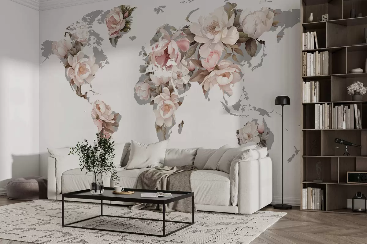 Fototapeten Eine zarte, cremige Weltkarte aus Blumen N° c00008