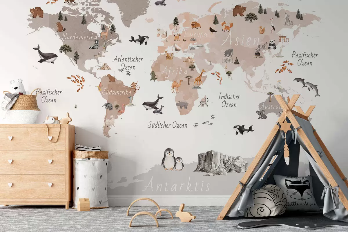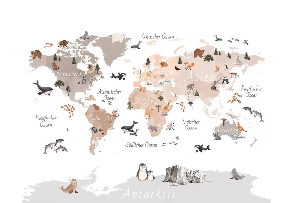 Fototapeten Eine beigefarbene Karte im Aquarellstil mit Tieren, Pflanzen und architektonischen Motiven. Beschriftungen auf Deutsch N° c00009dev3