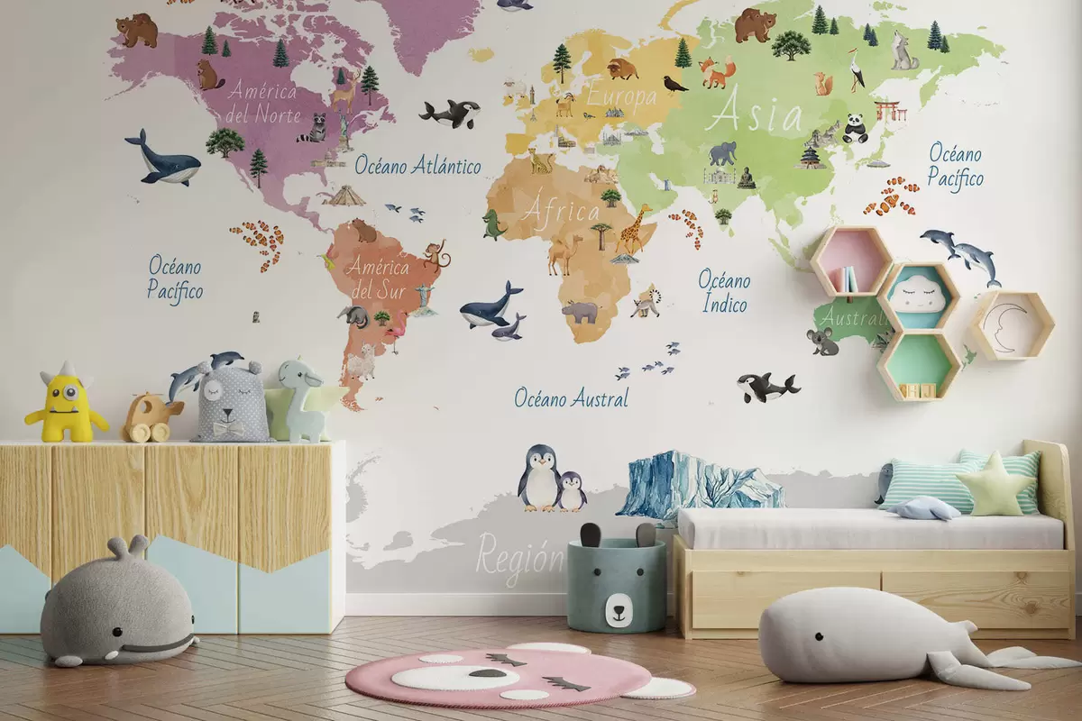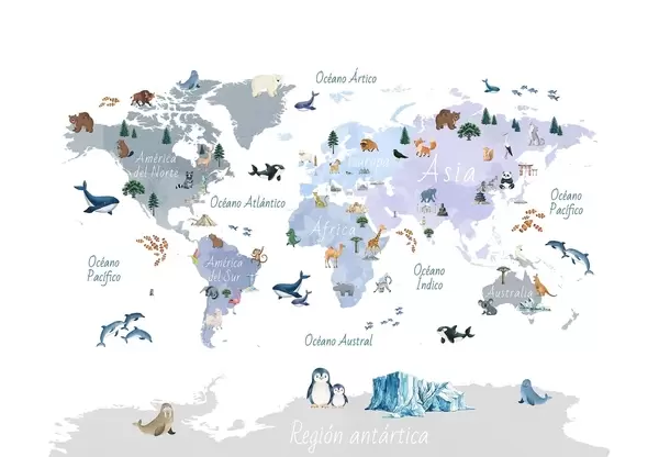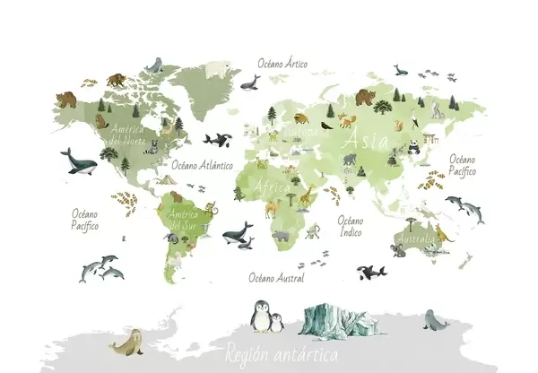 Fototapeten Eine Farbkarte im Aquarellstil mit Tieren, Pflanzen und architektonischen Motiven. Beschriftungen auf Spanisch N° c00009es
