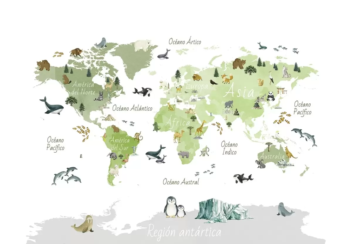 Fototapeten Eine Karte im Aquarellstil, auf der Tiere, Pflanzen und architektonische Elemente dargestellt sind. Beschriftungen auf Spanisch N° c00009esv2