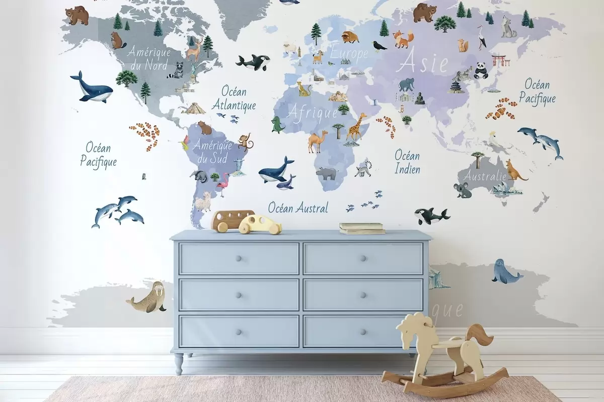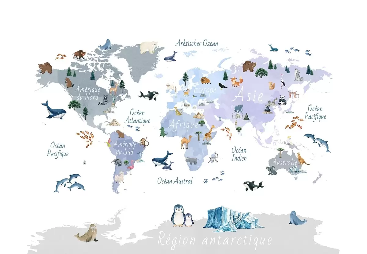 Fototapeten Eine Karte im Aquarellstil in Blau mit Tieren, Pflanzen und architektonischen Motiven. Beschriftungen auf Französisch N° c00009frv1