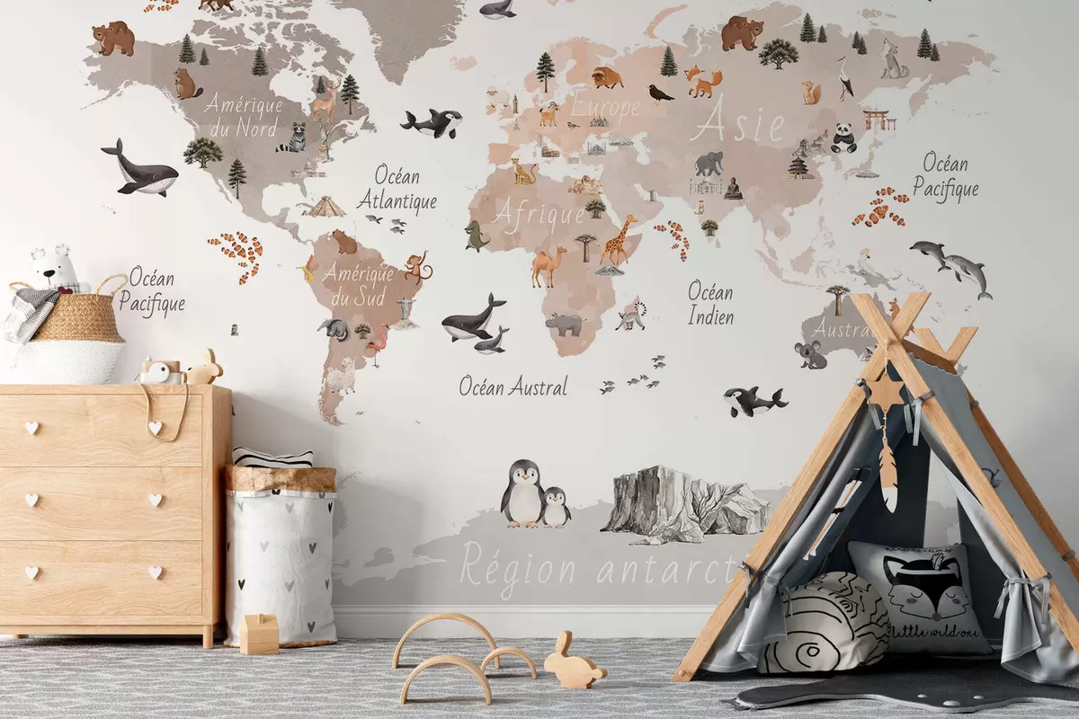 Fototapeten Eine beigefarbene Karte im Aquarellstil mit Tieren, Pflanzen und architektonischen Motiven. Beschriftungen auf Französisch N° c00009frv3