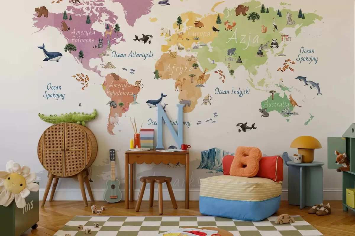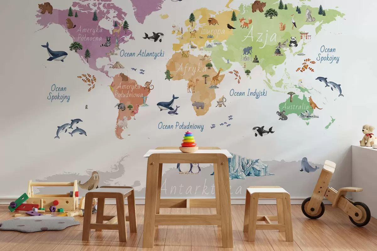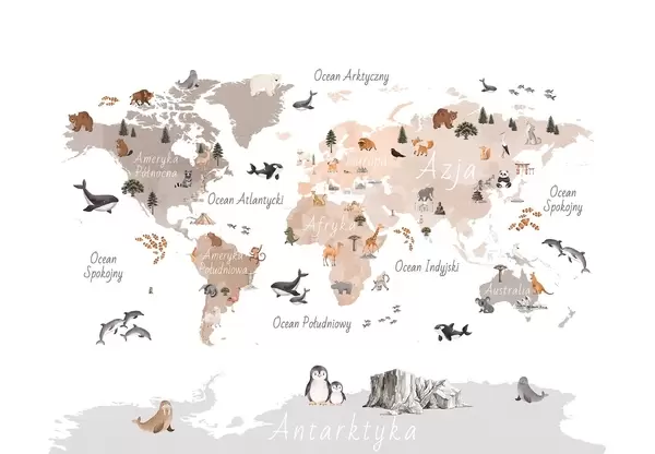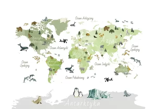 Fototapeten Eine Farbkarte im Aquarellstil mit Tieren, Pflanzen und architektonischen Motiven. Beschriftungen auf Polnisch N° c00009pl