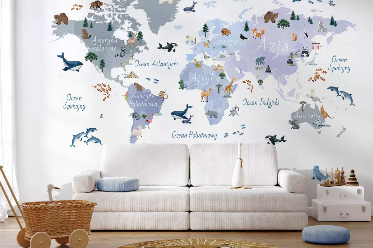 Fototapeten Eine blaue Karte im Aquarellstil mit Tieren, Pflanzen und architektonischen Motiven. Beschriftungen auf Polnisch N° c00009plv1