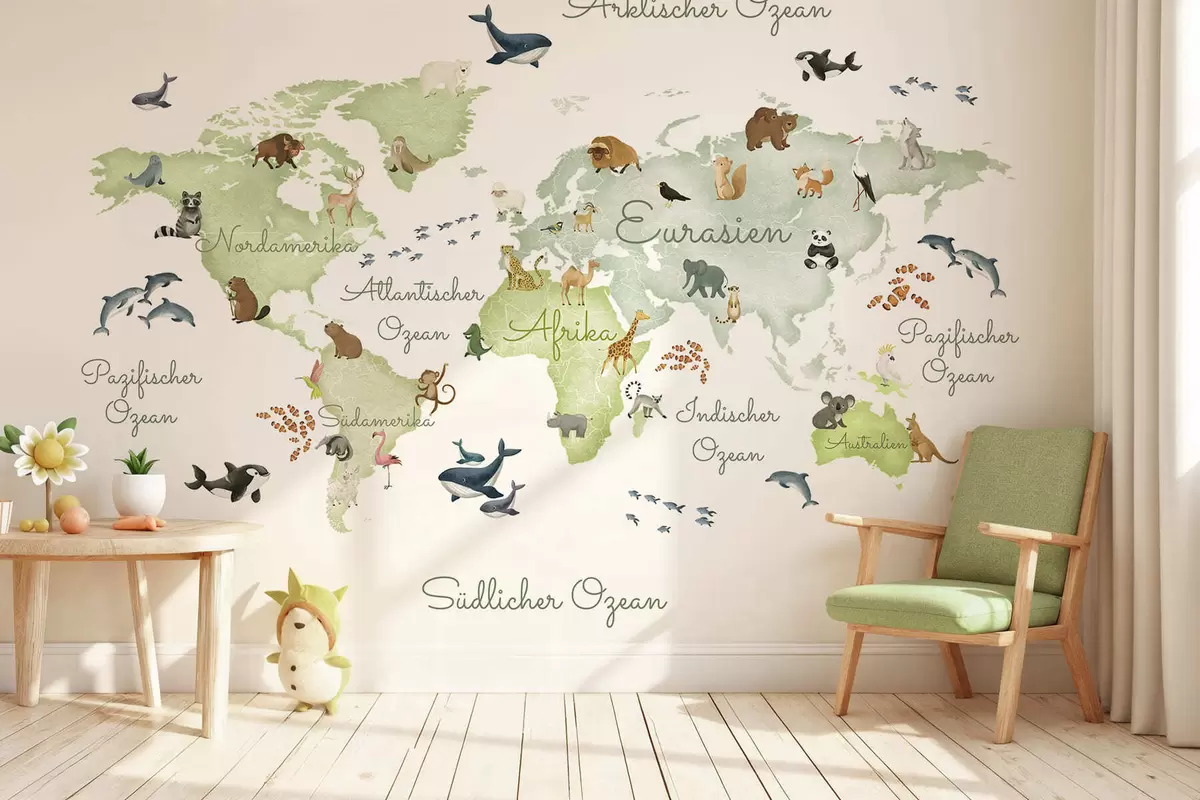 Fototapeten Eine grüne Karte im Aquarellstil mit Tiermotiven. Beschriftungen auf Deutsch N° c00012dev2