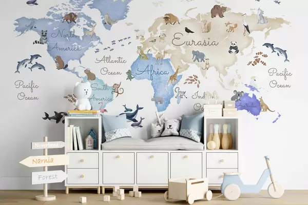 Fototapeten Eine blaue Karte im Aquarellstil mit Tiermotiven. Beschriftungen auf Englisch N° c00012env1