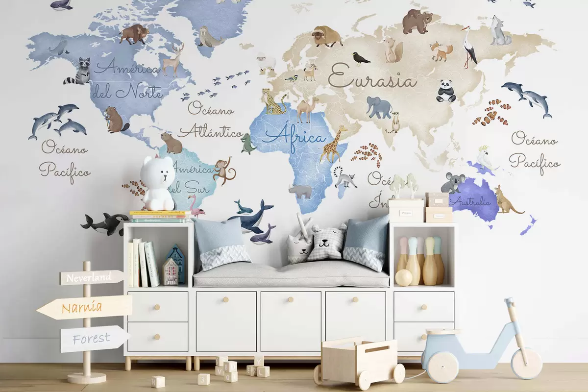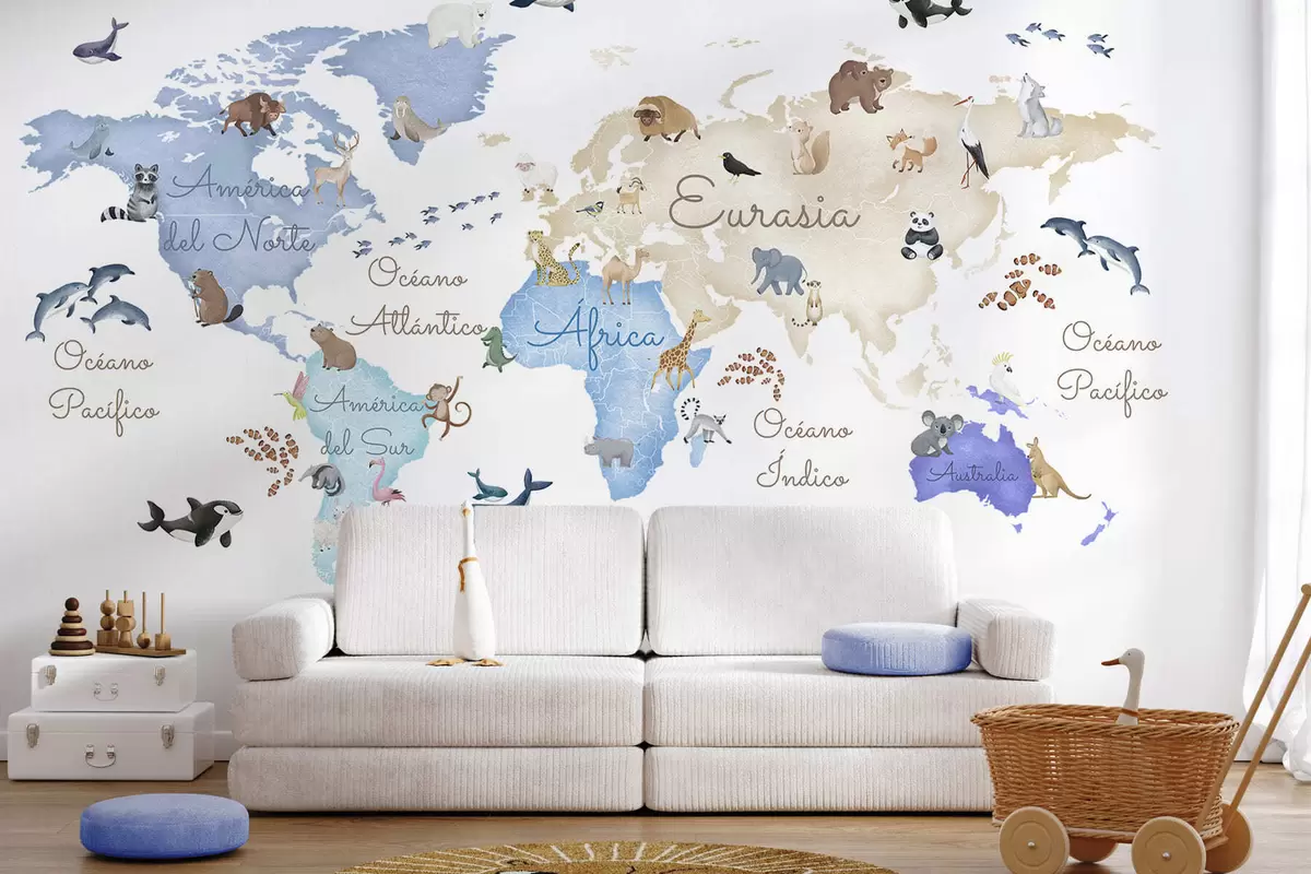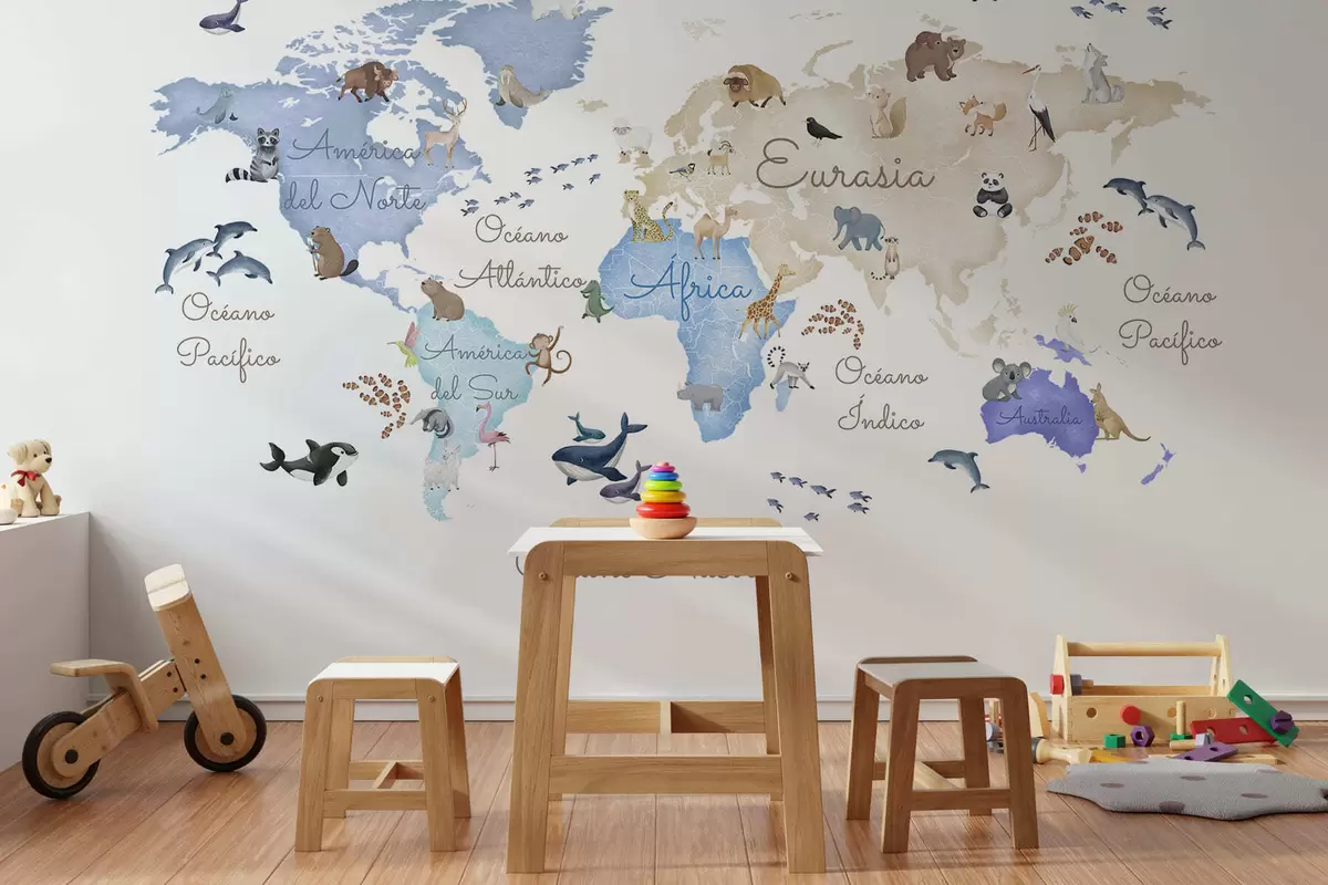 Fototapeten Eine blaue Karte im Aquarellstil mit Tiermotiven. Beschriftungen auf Spanisch N° c00012esv1