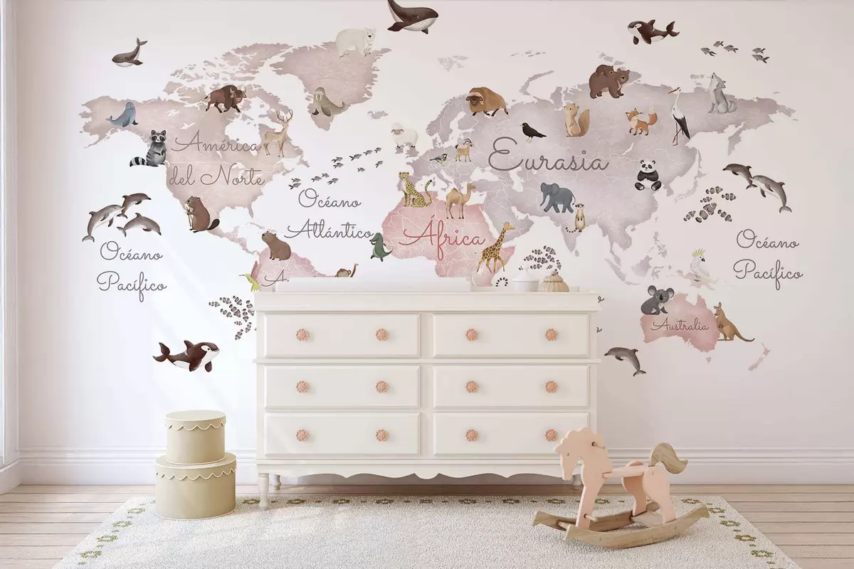 Fototapeten Eine beigefarbene Karte im Aquarellstil mit Tiermotiven. Beschriftungen auf Spanisch N° c00012esv3