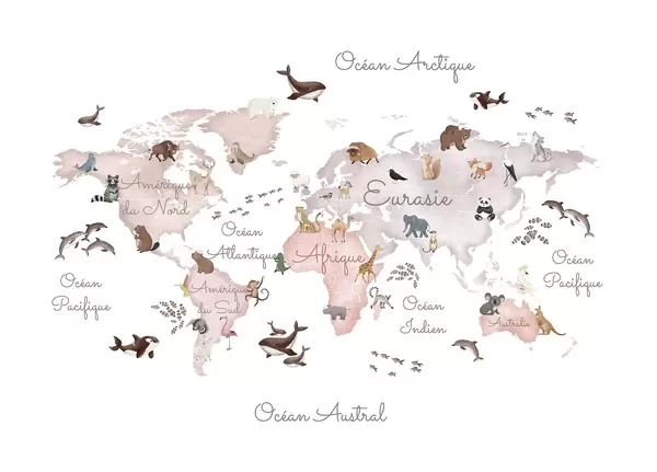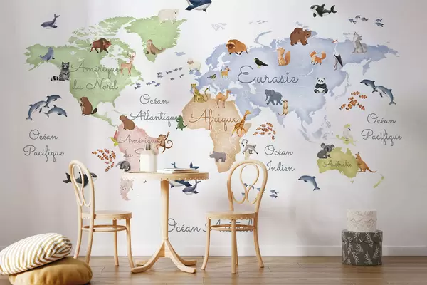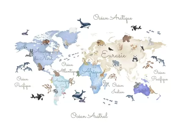 Fototapeten Eine Farbkarte im Aquarellstil mit Tiermotiven. Beschriftungen auf Französisch N° c00012fr