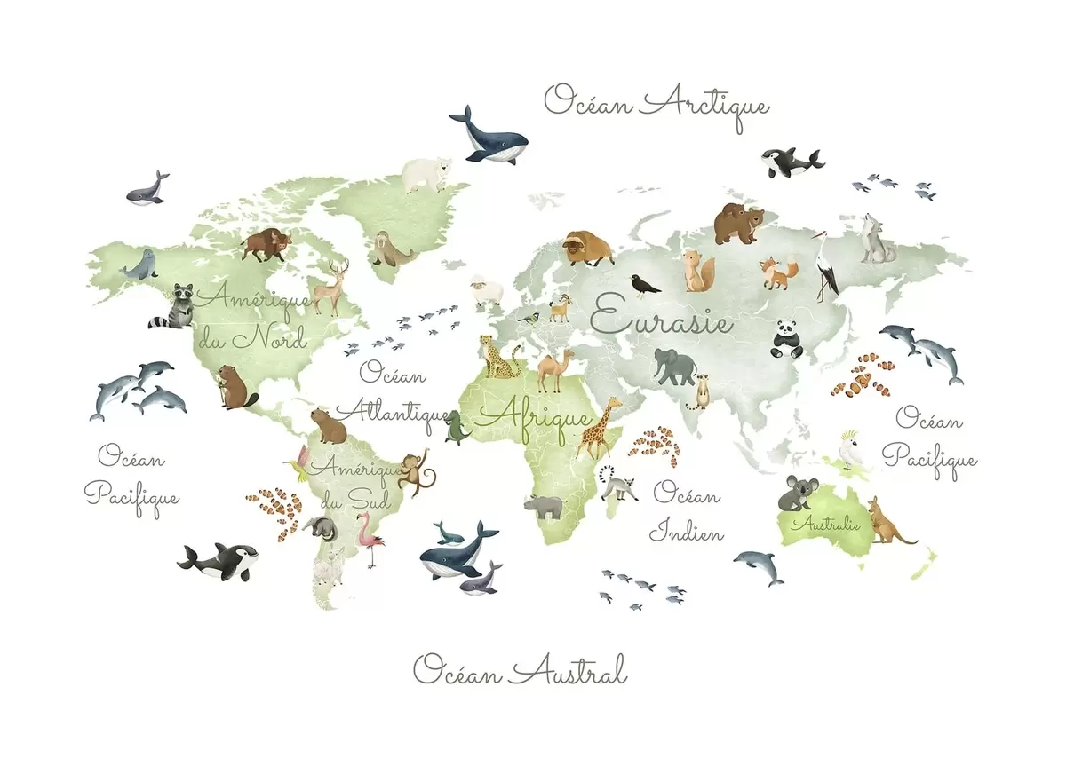 Fototapeten Eine grüne Karte im Aquarellstil mit Tiermotiven. Beschriftungen auf Französisch N° c00012frv2