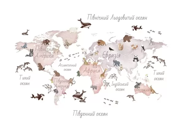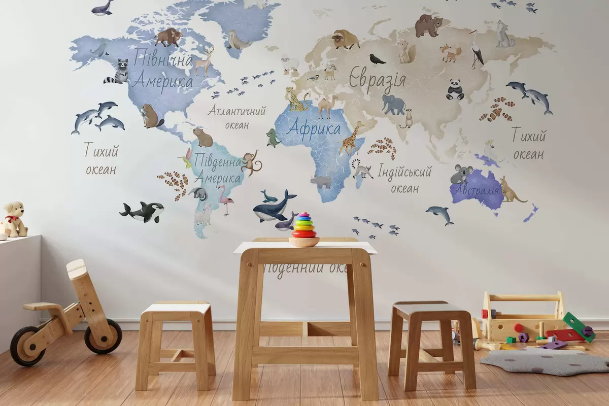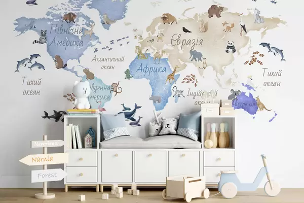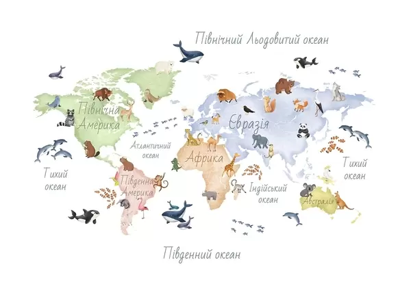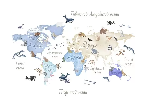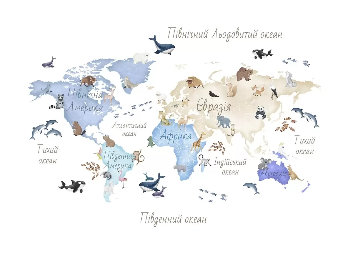 Fototapeten Eine blaue Karte im Aquarellstil mit Tiermotiven. Beschriftungen auf Ukrainisch N° c00012ukv1