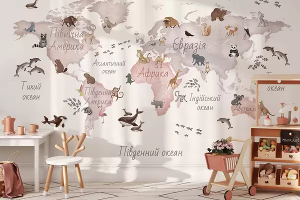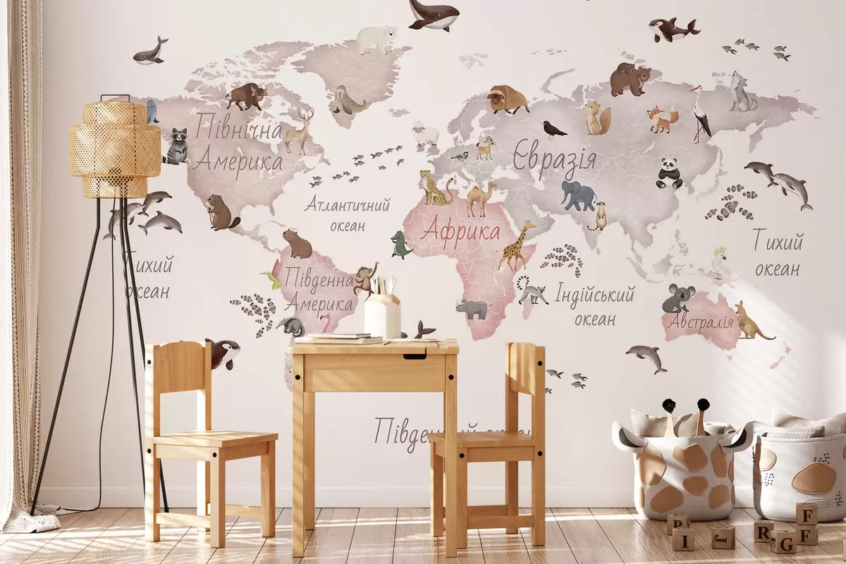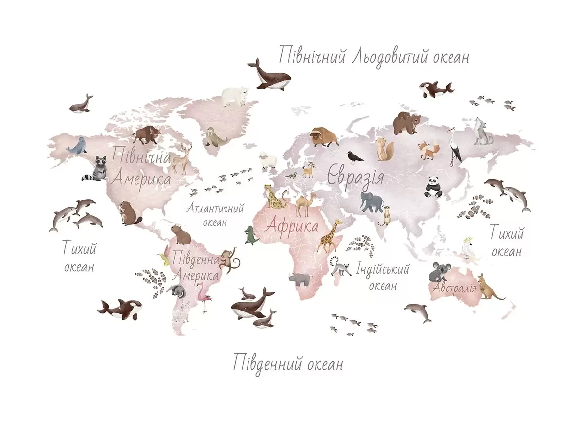 Fototapeten Eine beigefarbene Karte im Aquarellstil mit Tiermotiven. Beschriftungen auf Ukrainisch N° c00012ukv3