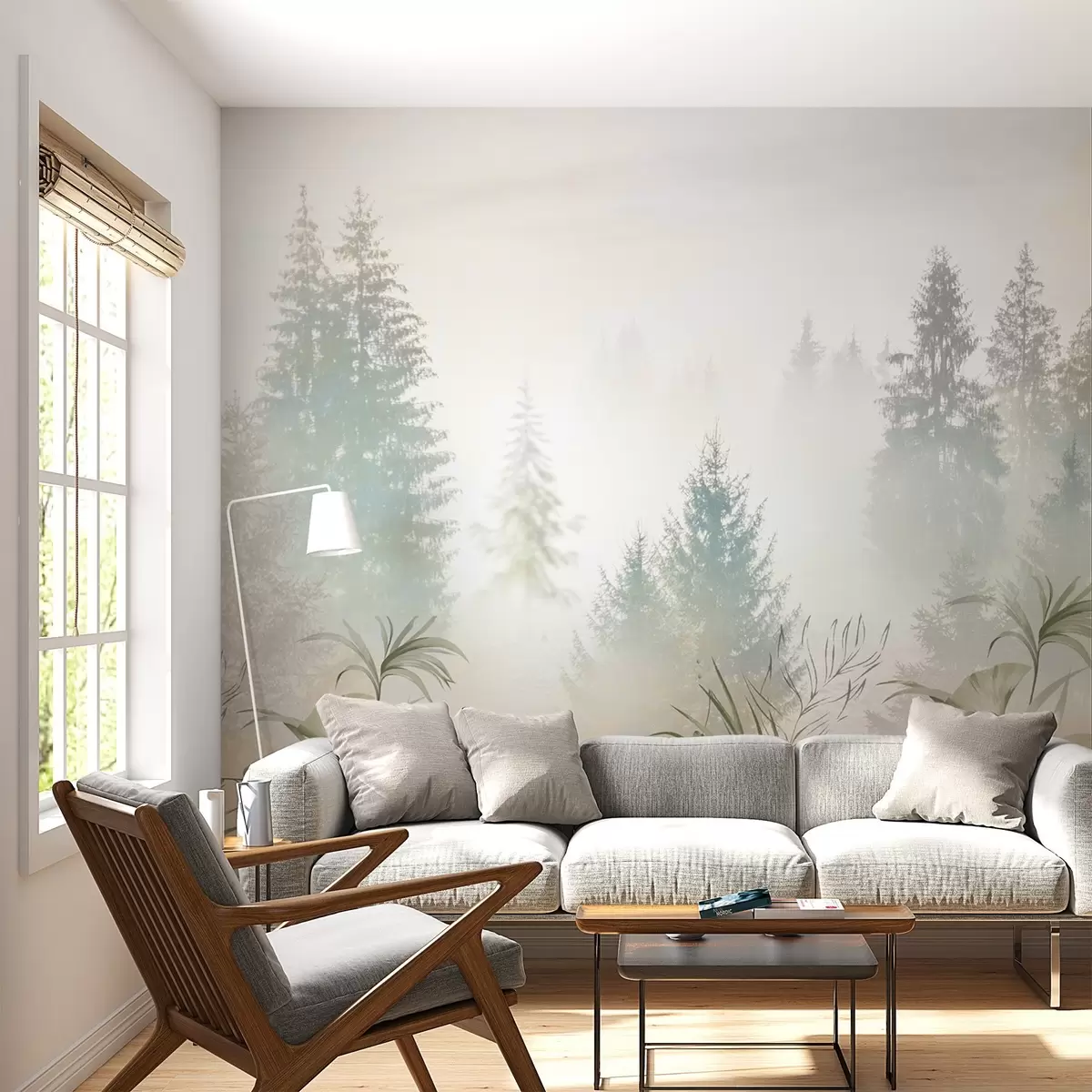 Fototapeten Nebliger Wald mit zarten Pflanzen N° u98051