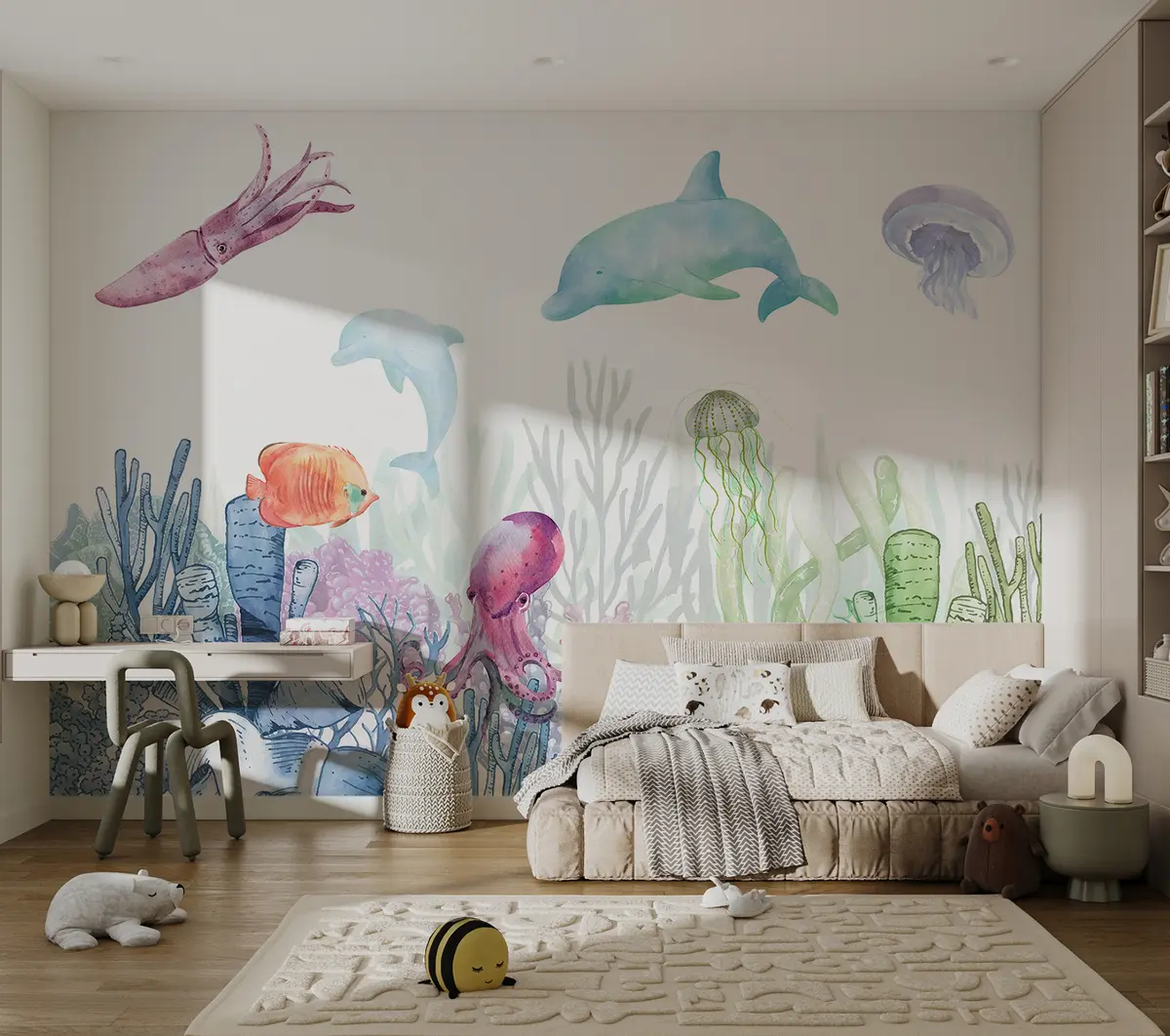Fototapeten Unterwasserwelt, Meerestiere, Aquarell, Korallen, Delphin, Oktopus N° u98899