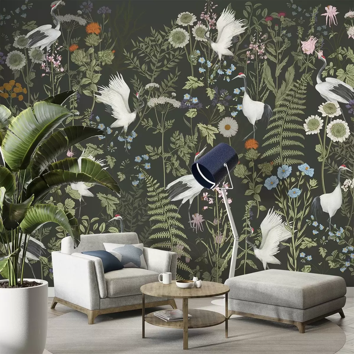 Fototapeten Kraniche tanzen zwischen leuchtenden Blumen N° w00380v2