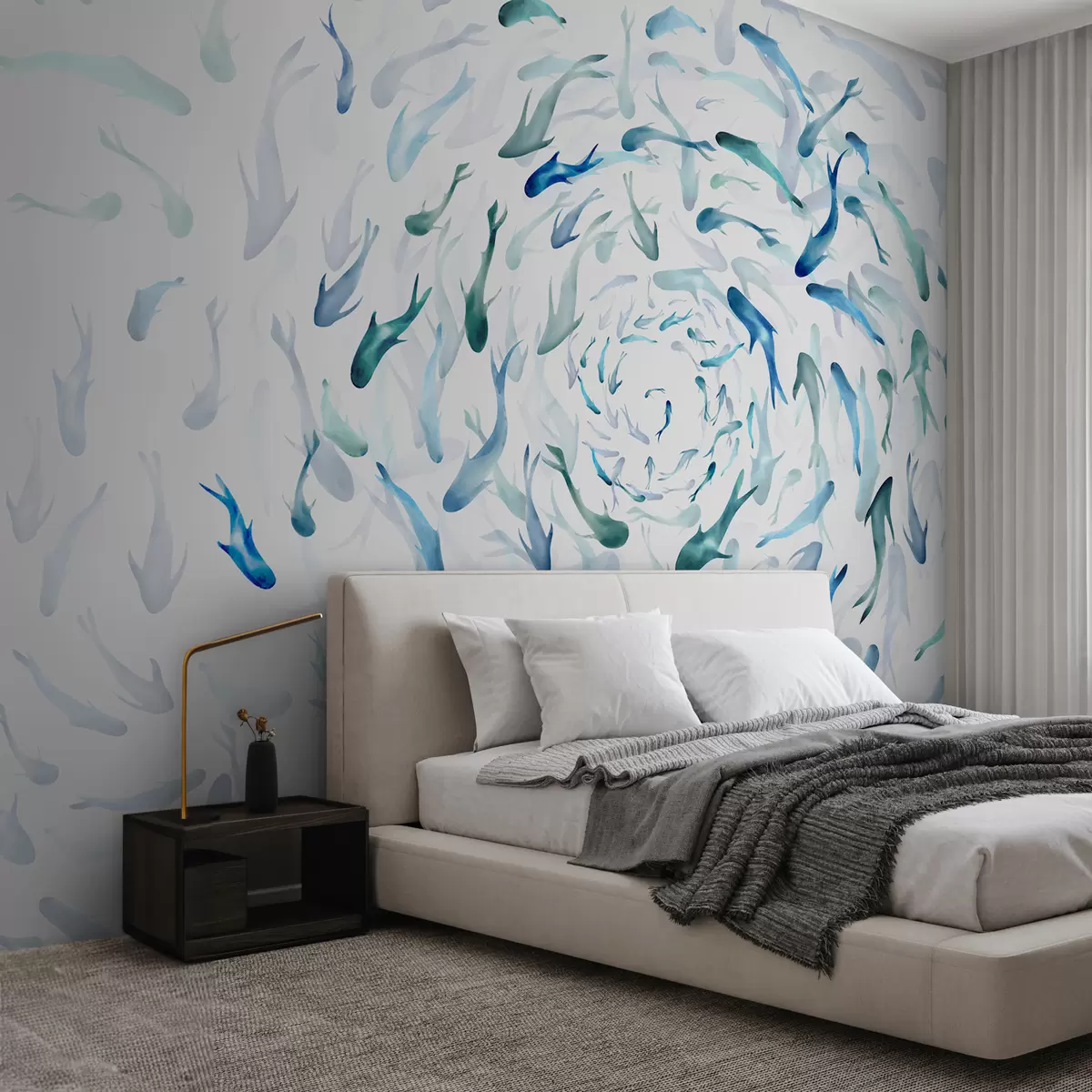 Fototapeten Wirbelnde Fische in einem Strudel, Fischtanz, Aquarell, Hai, abstrakte Komposition, Minimalismus, blaue, grüne Farbe N° w00510