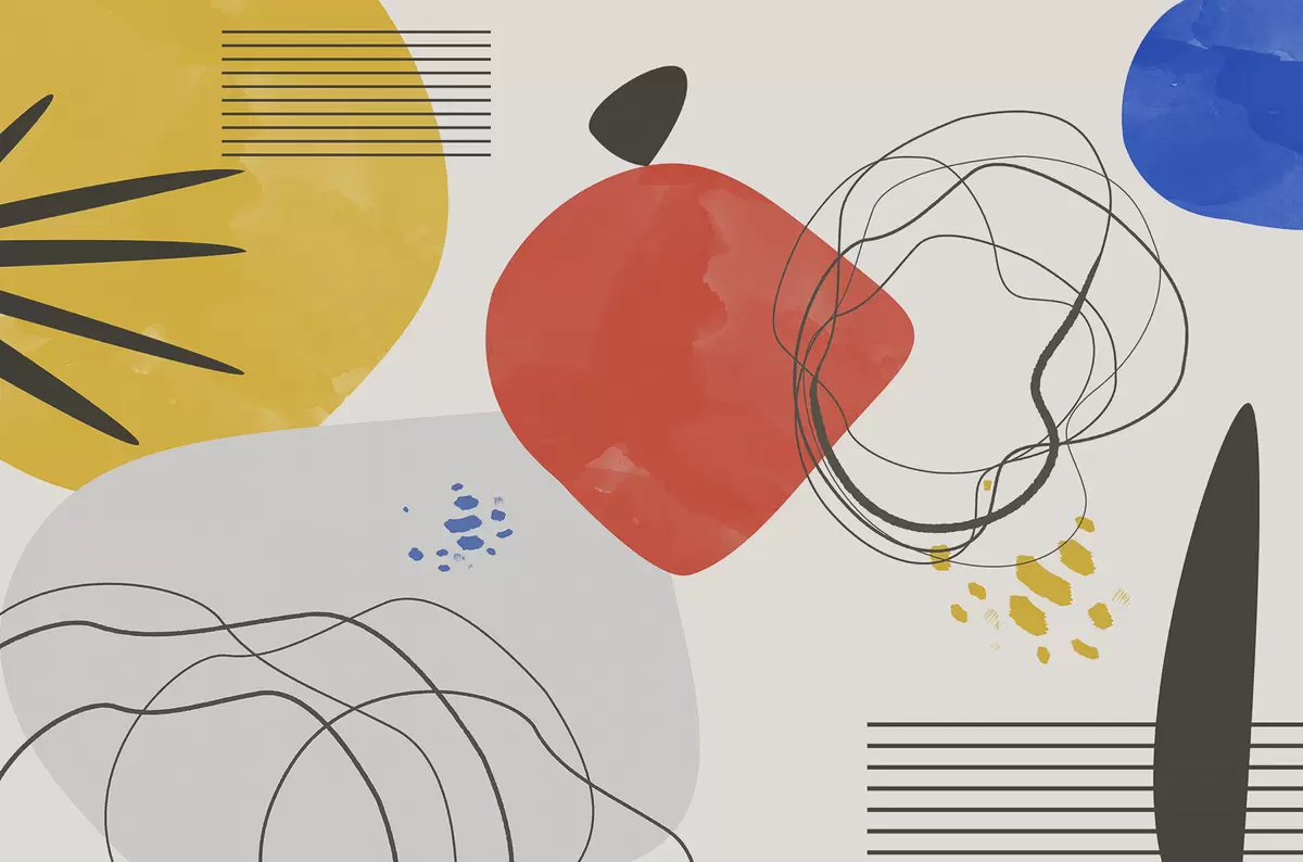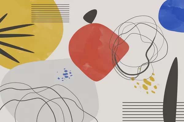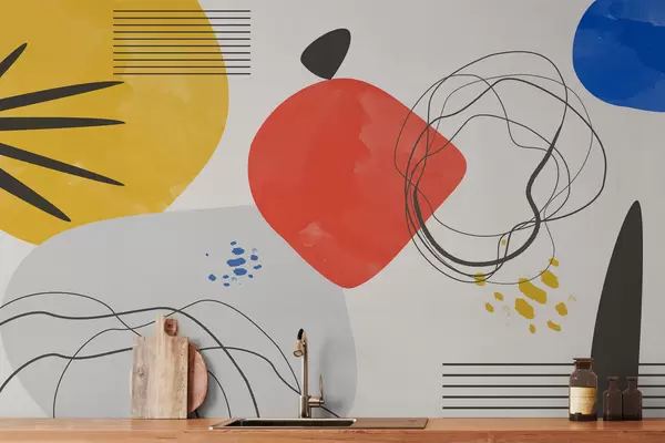 Fototapeten Abstraktion modern, Lichtblick, Boho, Geometrie, Topographie, Kurven, Linien, rot, gelb, blau, schwarz N° w00514