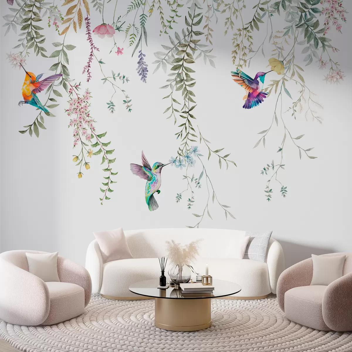Fototapeten Hängende Blumen und Blätter und wunderschöne Kolibris N° w00660