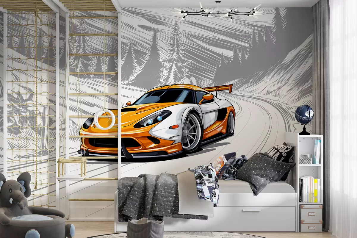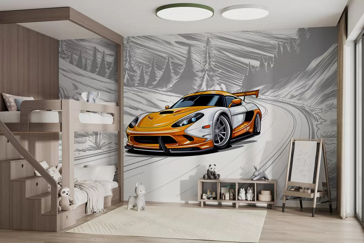 Fototapeten Ein orangefarbener Sportwagen auf einem grauen, skizzenhaften Straßenhintergrund zwischen Bergen und Tannen. Zur Dekoration eines Jungenzimmers N° w00954