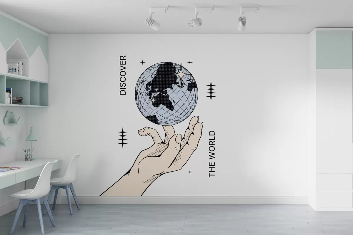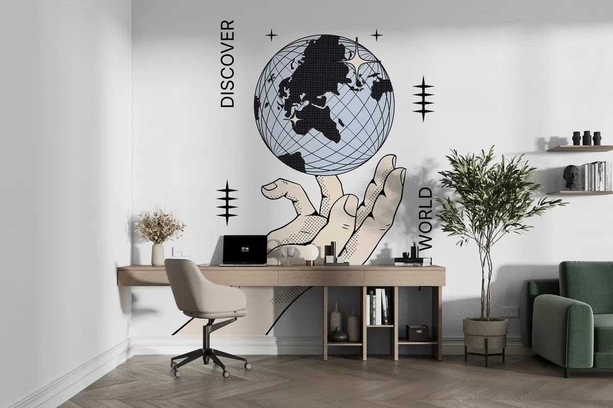 Fototapeten Beige Hand dreht den Globus auf weißem Hintergrund für die Raum- oder Bürodekoration N° w00984
