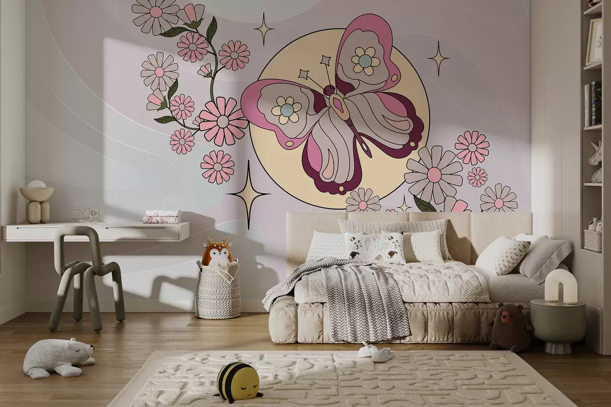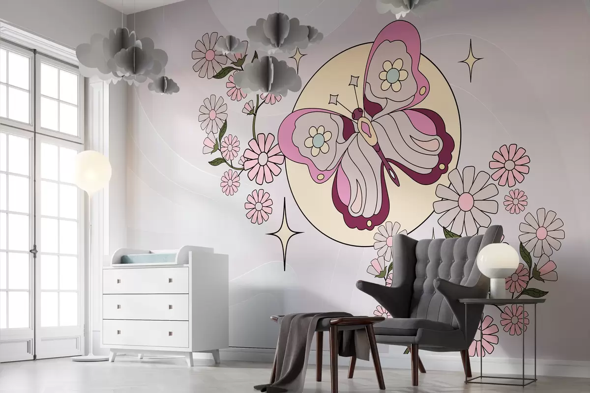 Fototapeten Tapete mit einem rosa Schmetterling auf hellgrau-rosa Hintergrund zwischen Blumen im schlichten Stil für ein Mädchenzimmer N° w00985