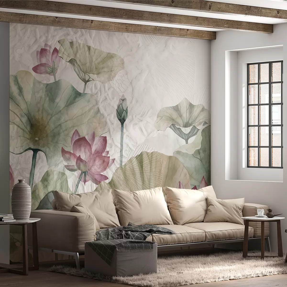 Fototapeten Rosa Lotusblüten mit grünen Blättern vor einem leicht strukturierten Hintergrund N° w01248