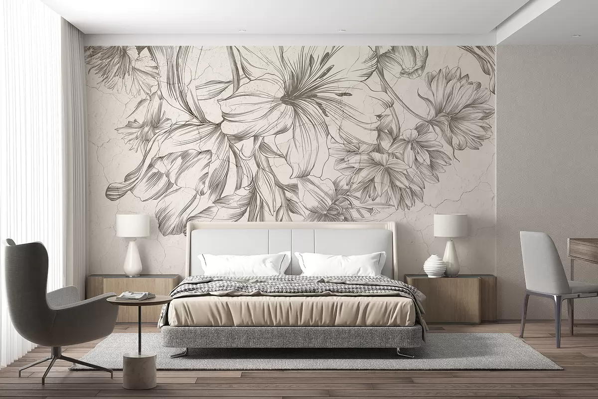 Fototapeten Eine schwarz-weiße Skizze eines großen Blumen-Grafikdrucks N° w01253