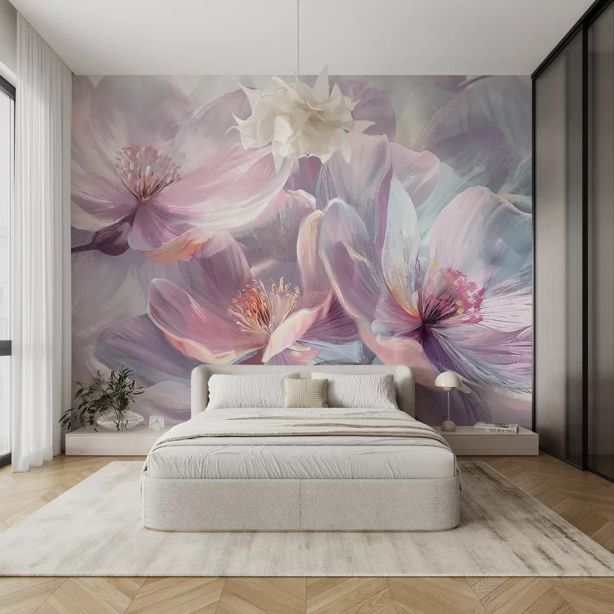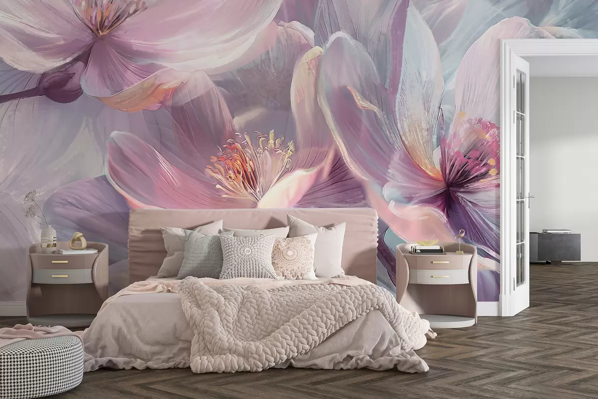 Fototapeten Zarte transparente pastellfarbene neonhellrosa und weiße Blüten mit weichem, unscharfem Hintergrund N° w01307