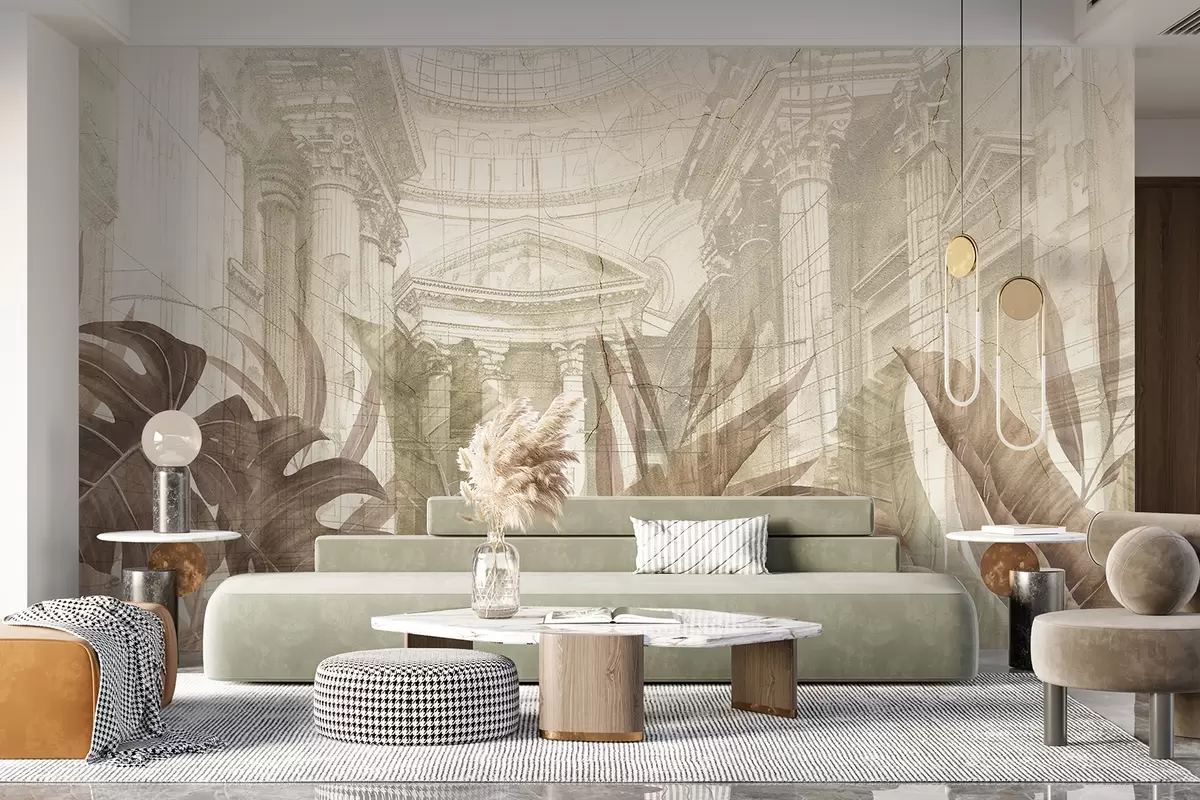 Fototapeten Eine großartige Zeichnung verzierten architektonischen Marmorsäulen und üppigen tropischen Sepiapflanzen N° w01311v1