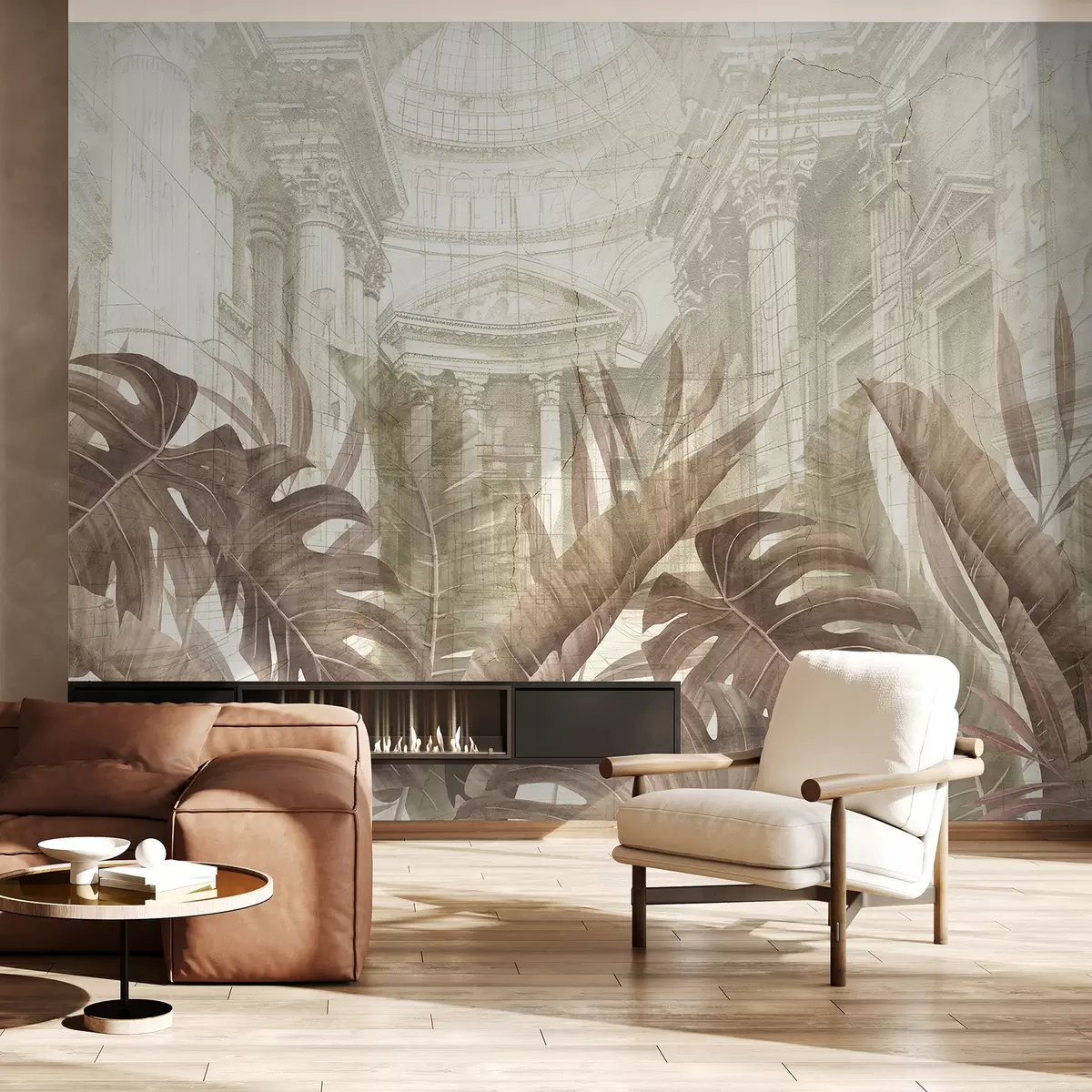 Fototapeten Eine großartige Zeichnung verzierten architektonischen Marmorsäulen und üppigen tropischen Sepiapflanzen N° w01311v1