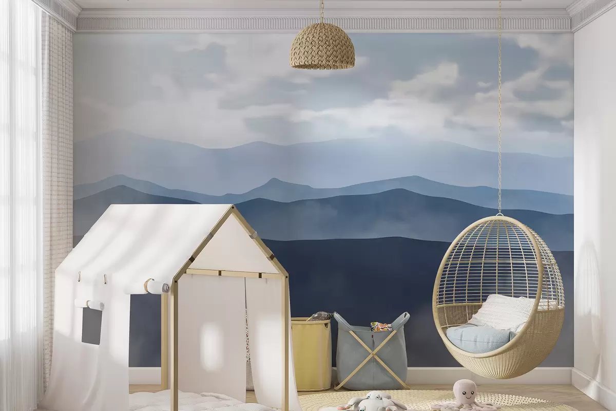Fototapeten Neblige minimalistische Berglandschaft mit sanften Hügeln und bewölktem Himmel N° w01317